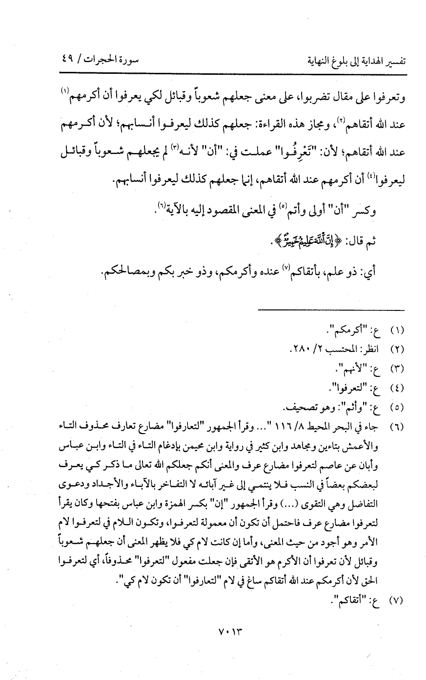 وتعرفوا على مقال تضربوا، على معنى جعلهم شعوباً وقبائل لكي يعرفوا أن أكرمهم عند الله أتقاهم، ومجاز هذه القراءة: جعلهم كذلك ليعرفوا أنسابهم؛ لأن أكرمهم عند الله أتقاهم؛ لأن: " تَعْرِفُوا " عملت في: " أن " لأنه لم يجعلهم شعوباً قبائل ليعرفوا أن أكرمهم عند الله أتقاهم، إنما جعلهم كذلك ليعرفوا أنسابهم.