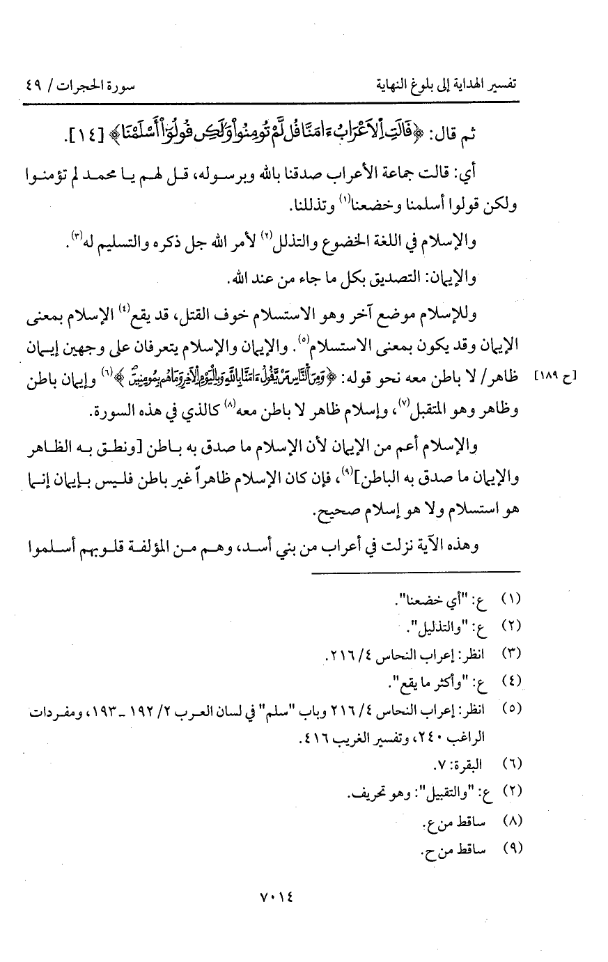 وللإسلام موضع آخر وهو الاستسلام خوف القتل، قد يقع الإسلام بمعنى الإيمان وقد يكون بمعنى الاستسلام. والإيمان والإسلام يتعرفان على وجهين إيمان ظاهر/ لا باطن معه نحو قوله: {وَمِنَ الناس مَن يَقُولُ آمَنَّا بالله وباليوم الآخر وَمَا هُم بِمُؤْمِنِينَ} [البقرة: 8] وإيمان باطن وظاهر وهو المتقبل، وإسلام ظاهر لا باطن معه كالذي في هذه السورة.