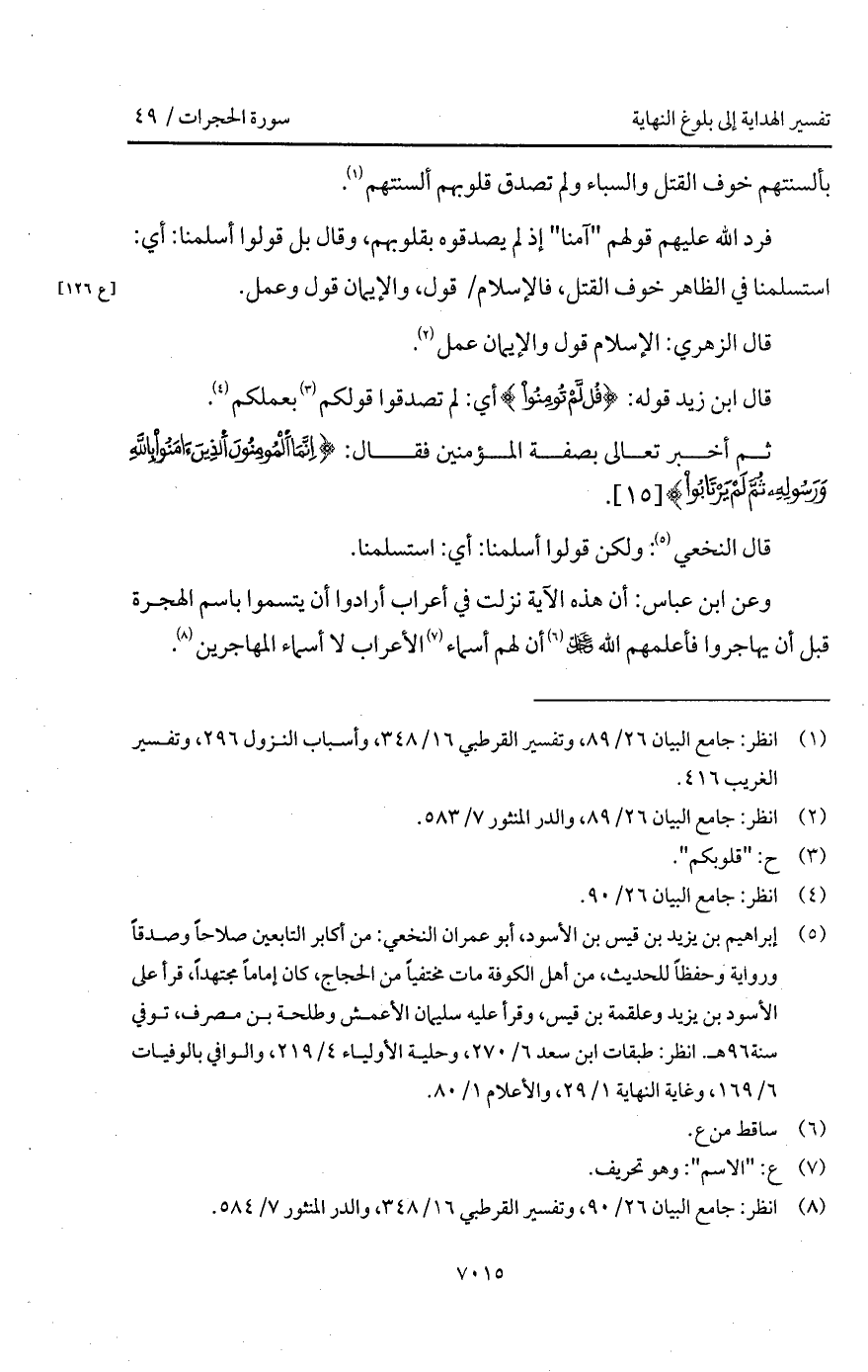 وعن ابن عباس: أن هذه الآية نزلت في أعراب أرادوا أن يتسموا باسم الهجرة قبل أن يهاجروا فأعلمهم الله D أن لهم أسماء الأعراب لا أسماء المهاجرين.