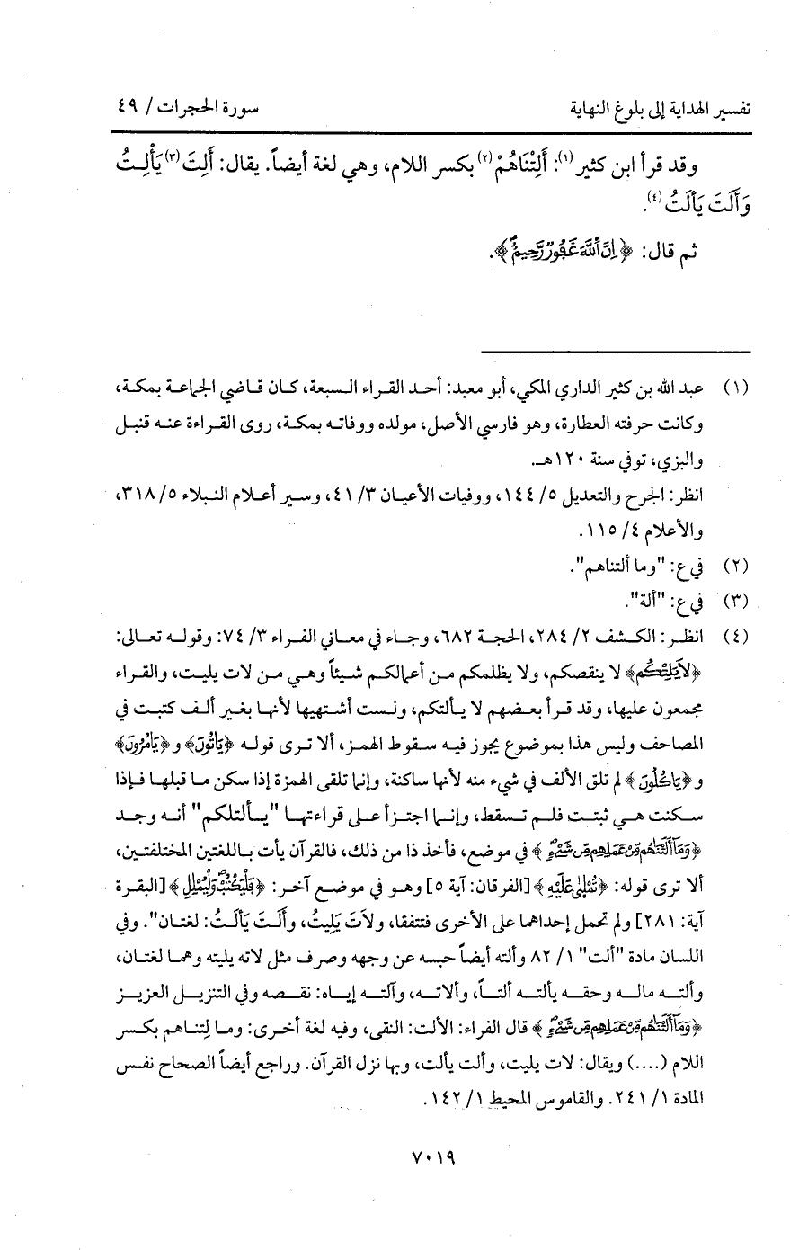 وقد قرأ ابن كثير: أَلِتْنَاهُمْ بكسر اللام، وهي لغة أيضاً. يقال: أَلِتَ يَأْلِتُ وَأَلَتَ يَألَتُ.