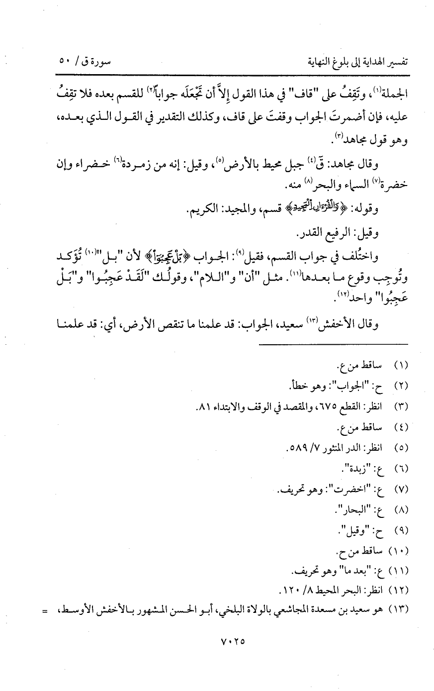 الجملة، وتَقِفُ على " قاف " في هذا القول إِلاَّ أن تَجْعَلَه جواباً للقسم بعده فلا تقِفُ عليه، فإن أضمرتَ الجواب وقفتَ على قاف، وكذلك التقدير في القول الذي بعده، وهو قول مجاهد.