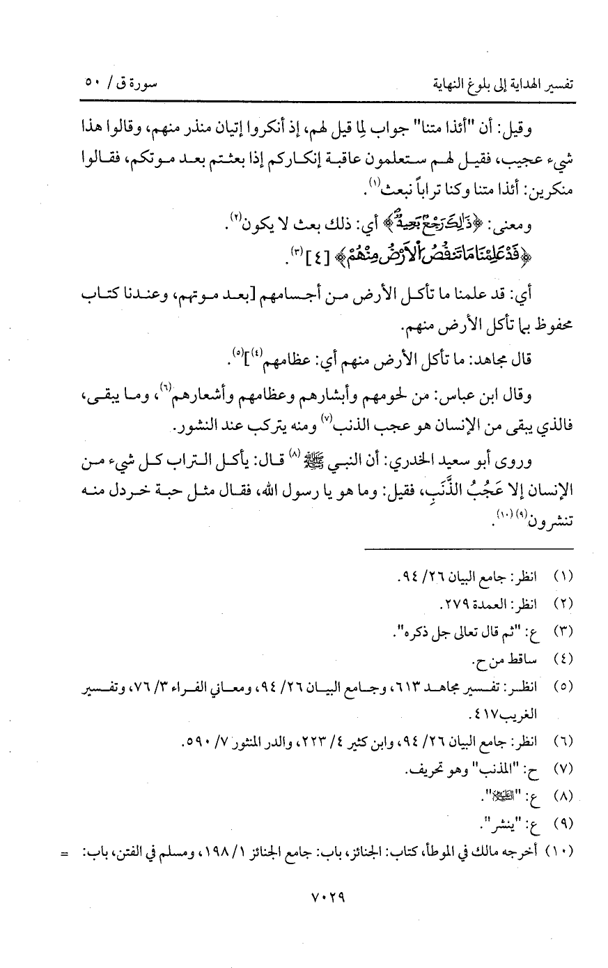 وروى أبو سعيد الخدري: " أن النبي A قال: يأكل التراب كل شيء من الإنسان إلا عَجُبُ الذَّنَبِ، فقيل: وما هو يا رسول الله، فقال مثل حبة خردل منه تنشرون ".