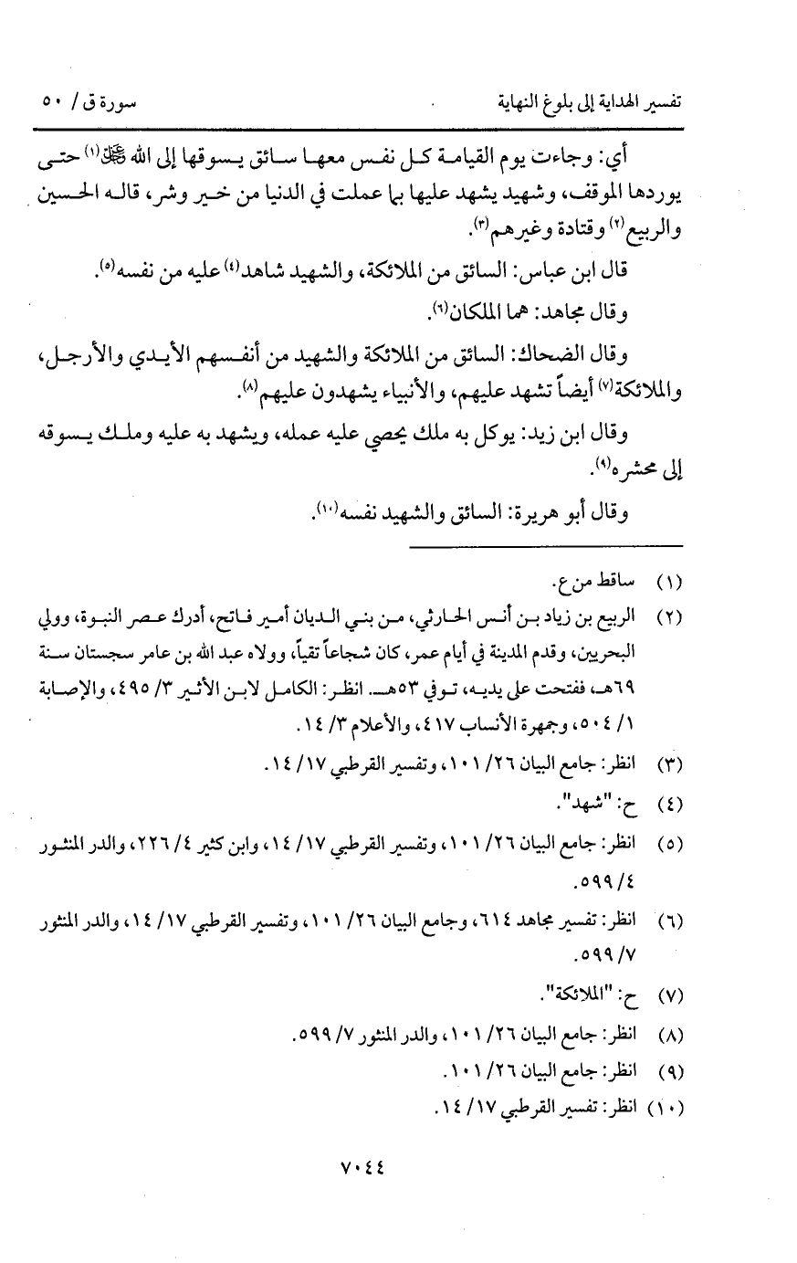 أي: وجاءت يوم القيامة كل نفس معها سائق يسوقها إلى الله D حتى يوردها الموقف، وشهيد يشهد عليها بما عملت في الدنيا من خير وشر، قاله الحسين والربيع وقتادة وغيرهم.