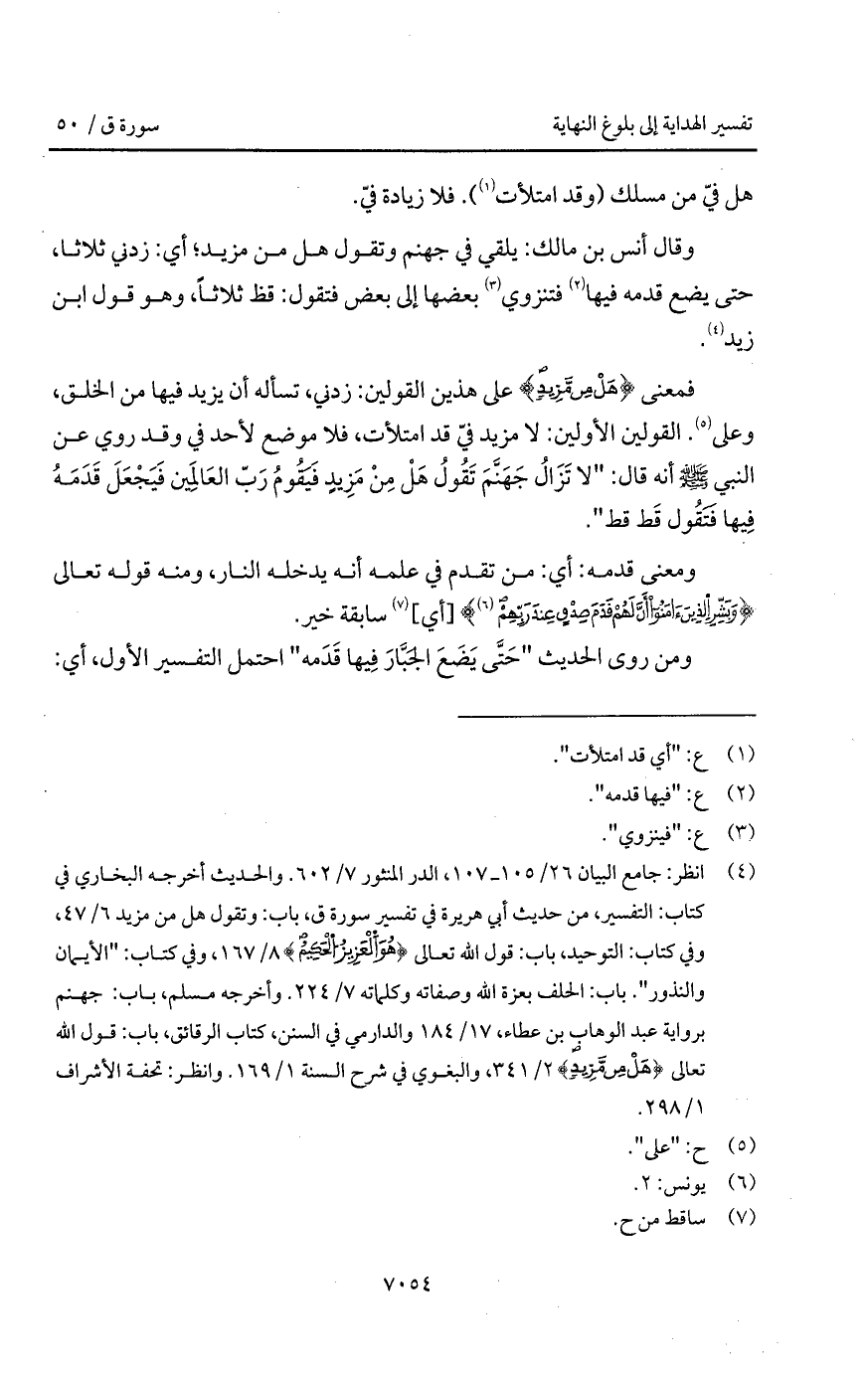 فمعنى {هَلْ مِن مَّزِيدٍ} على هذين القولين: زدني، تسأله أن يزيد فيها من الخلق، وعلى. القولين الأولين: لا مزيد فيّ قد امتلأت، فلا موضع لأحد في وقد روي عن النبي A أنه قال: " لا تَزَالُ جَهَنَّمَ تَقُولُ هَلْ مِنَ مَزِيدٍ فَيَقُومُ رَبّ العَالَمِين فَيَجْعَلَ قَدَمَهُ فِيها فَتَقُول قَط قط ".
