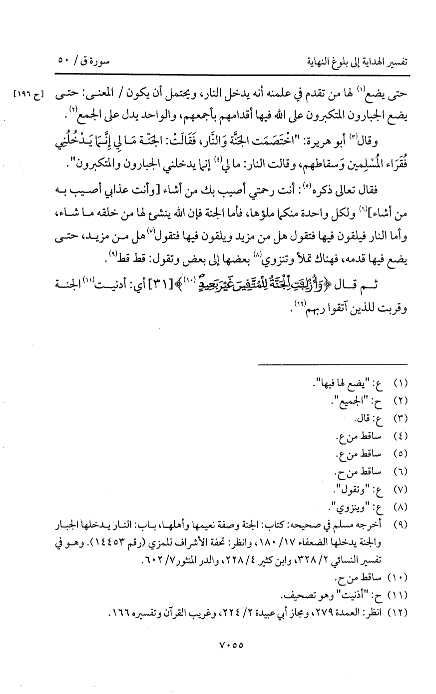 فقال تعالى ذكره: أنت رحمتي أصيب بك من أشاء [وأنت عذابي أصيب به من أشاء] ولكل واحدة منكما ملؤها، فأما الجنة فإن الله ينشئ لها من خلقه ما شاء، وأما النار فيلقون فيها فتقول هل من مزيد ويلقون فيها فتقول هل من مزيد، حتى يضع فيها قدمه، فهناك تملأ وتنزوي بعضها إلى بعض وتقول: قط قط.
