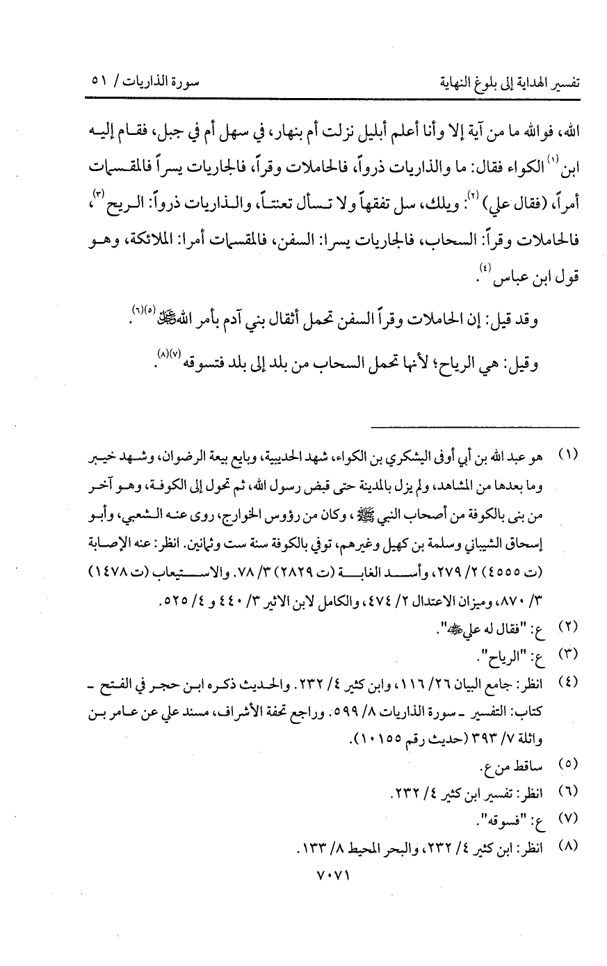 الله، فوالله ما من آية إلا وأنا أعلم أبليل نزلت أم بنهار، في سهل أم في جبل، فقام إليه ابن الكواء فقال: ما والذاريات ذرواً، فالحاملات وقراً، فالجاريات يسراً فالمقسمات أمراً، (فقال علي): ويلك، سل تفقهاً ولا تسأل تعنتاً، والذاريات ذوراً: الريح، فالحاملات وقراً: السحاب، فالجاريات يسرا: السفن، فالمقسمات أمرا: الملائكة، وهو قول ابن عباس.