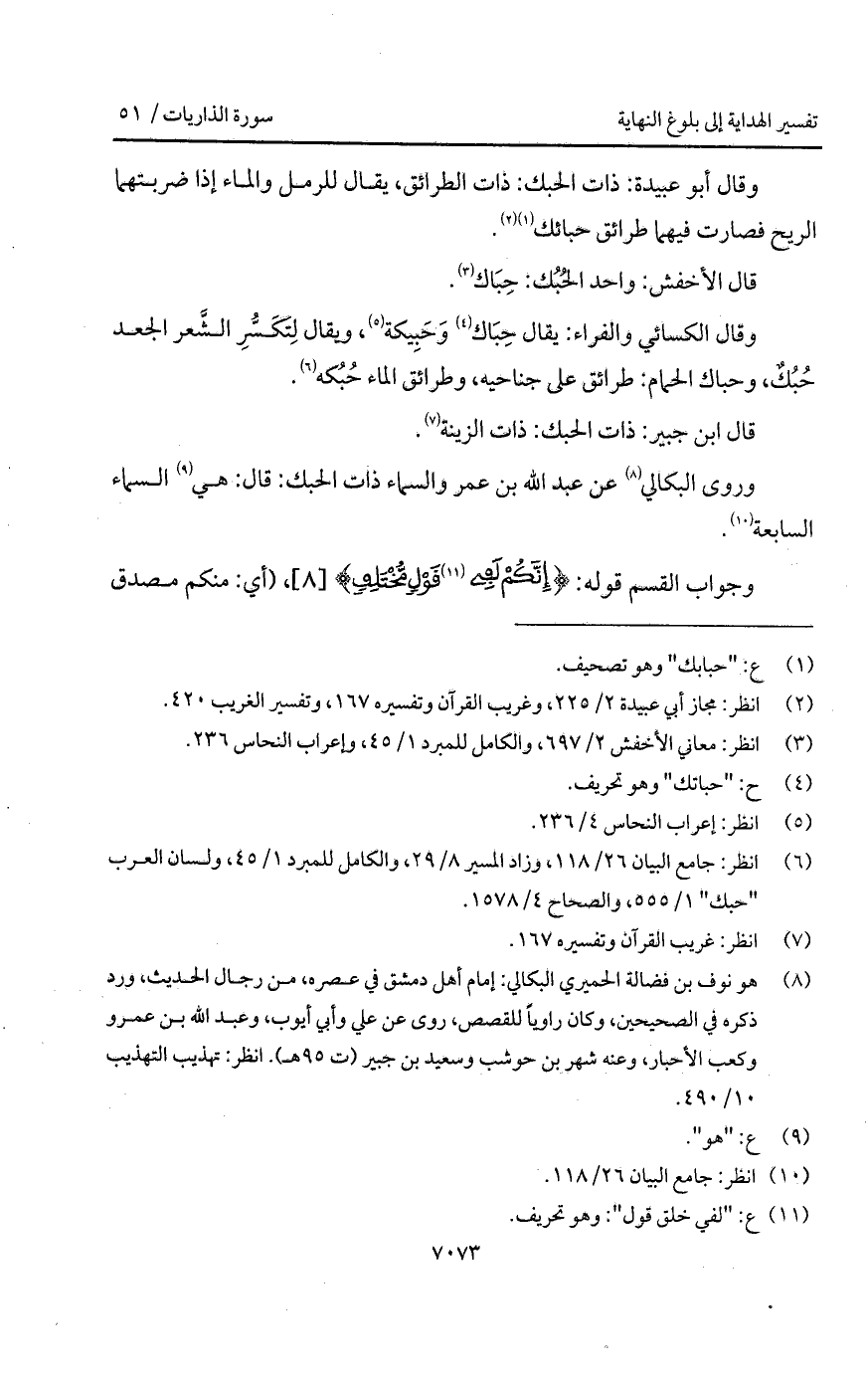 وقال أبو عبيدة: ذات الحبك: ذات الطرائق، يقال للرمل والماء إذا ضربتهما الريح فصارت فيهما طرائق حبائك.
