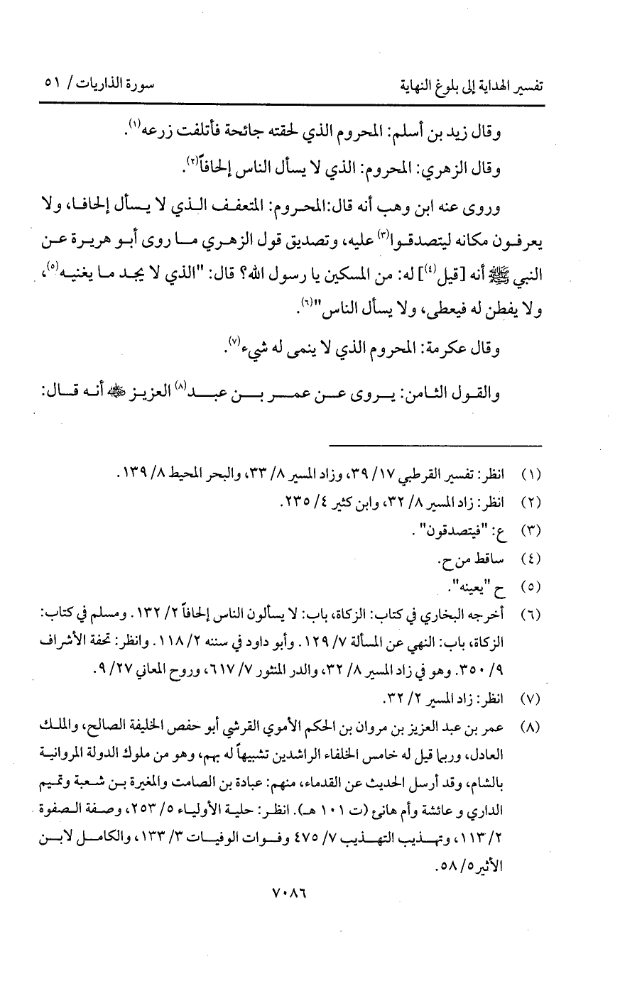 وروى عنه ابن وهب أنه قال: المحروم: المتعفف الذي لا يسأل إلحافا، ولا يعرفون مكانه ليتصدقوا عليه، وتصديق قول الزهري ما روى أبو هريرة عن النبي A أنه [قيل] له: " من المسكين يا رسول الله؟ قال: " الذي لا يجد ما يغنيه، ولا يفطن له فيعطى، ولا يسأل الناس " ".
