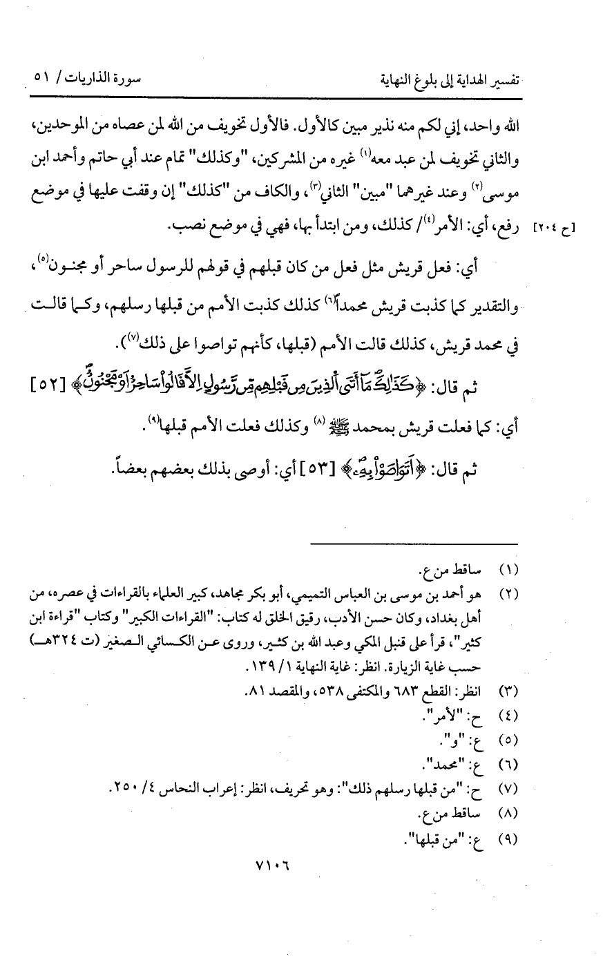 الله واحد، إني لكم منه نذير مبين كالأول. فالأول تخويف من الله لمن عصاه من الموحدين، والثاني تخويف لمن عبد معه غيره من المشركين، " وكذلك " تمام عند أبي حاتم وأحمد ابن موسى وعند غيرهما " مبين " الثاني، والكاف من " كذلك " إن وقفت عليها في موضع رفع، أي: الأمر / كذلك، ومن ابتدأ بها، فهي في موضع نصب.