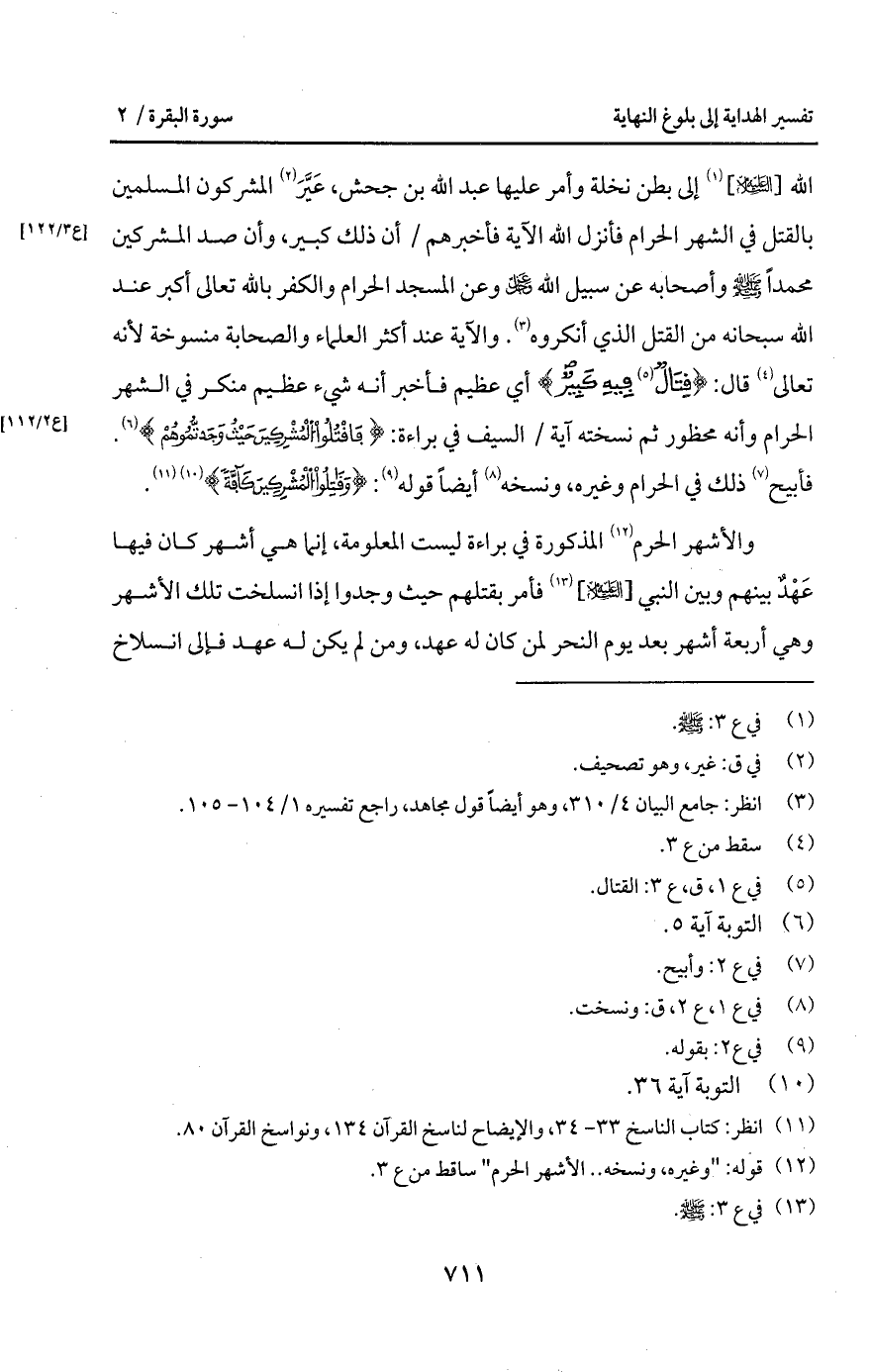 الله [عليه السلام] إلى بطن نخلة وأمر عليها عبد الله بن جحش، عَيَّرَ المشركون المسلمين بالقتل في الشهر الحرام فأنزل الله الآية فأخبرهم/ أن ذلك كبير، وأن صد المشركين محمداً A وأصحابه عن سبيل الله D وعن المسجد الحرام والكفر بالله تعالى أكبر عند الله سبحانه من القتل الذي أنكروه. والآية عند أكثر العلماء والصحابة منسوخة لأنه تعالى قال: {قِتَالٌ فِيهِ كَبِيرٌ} أي عظيم فأخبر أنه شيء عظيم منكر في الشهر الحرام وأنه محظور ثم نسخته آية/ السيف في براءة: {فاقتلوا المشركين حَيْثُ وَجَدتُّمُوهُمْ} [التوبة: 5]. فأبيح ذلك في الحرام وغيره، ونسخه أيضا قوله: {وَقَاتِلُواْ المشركين كَآفَّةً} [التوبة: 36].