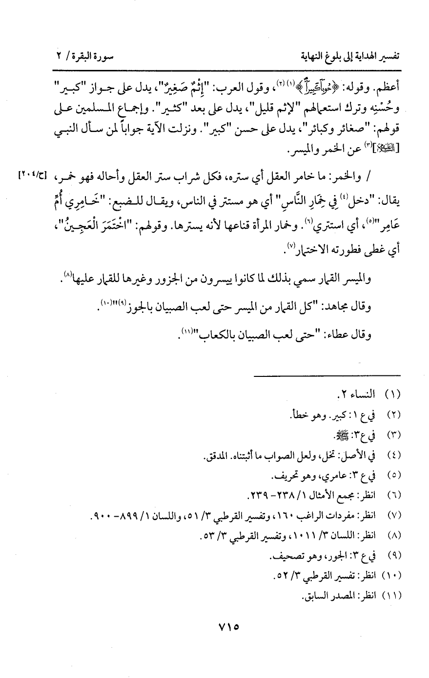 أعظم. وقوله: {حُوباً كَبِيراً} [النساء: 2]، وقول العرب: " إِثْمٌ صَغِيرٌ "، يدل على جواز " كبير " وحُسْنِه وترك استعمالهم " الإثم قليل "، يدل على بعد " كثير ". وأجماع المسلمين على قولهم: " صغائر وكبائر "، يدل على حسن " كبير ". ونزلت الآية جواباً لمن سأل النبي [عليه السلام] عن الخمر والميسر.