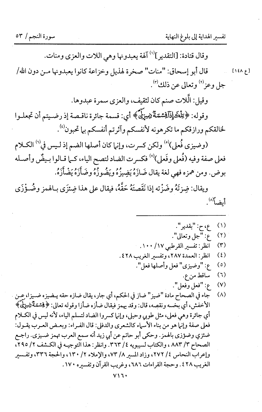 (وضيزى فُعلى) ولكن كسرت، وإنما كان أصلها الضم إذ ليس في الكلام فعلى صفة وفيه (فُعلى وفَعلى) فكسرت الضاد لتصح الياء، كما قالوا بيضٌ وأصله بوض. ومن همزه فهي لغة يقال ضَازَهُ يَضِيزُهُ ويَضُوزُهُ وضَأَزَهُ يَضْأَزَهُ.