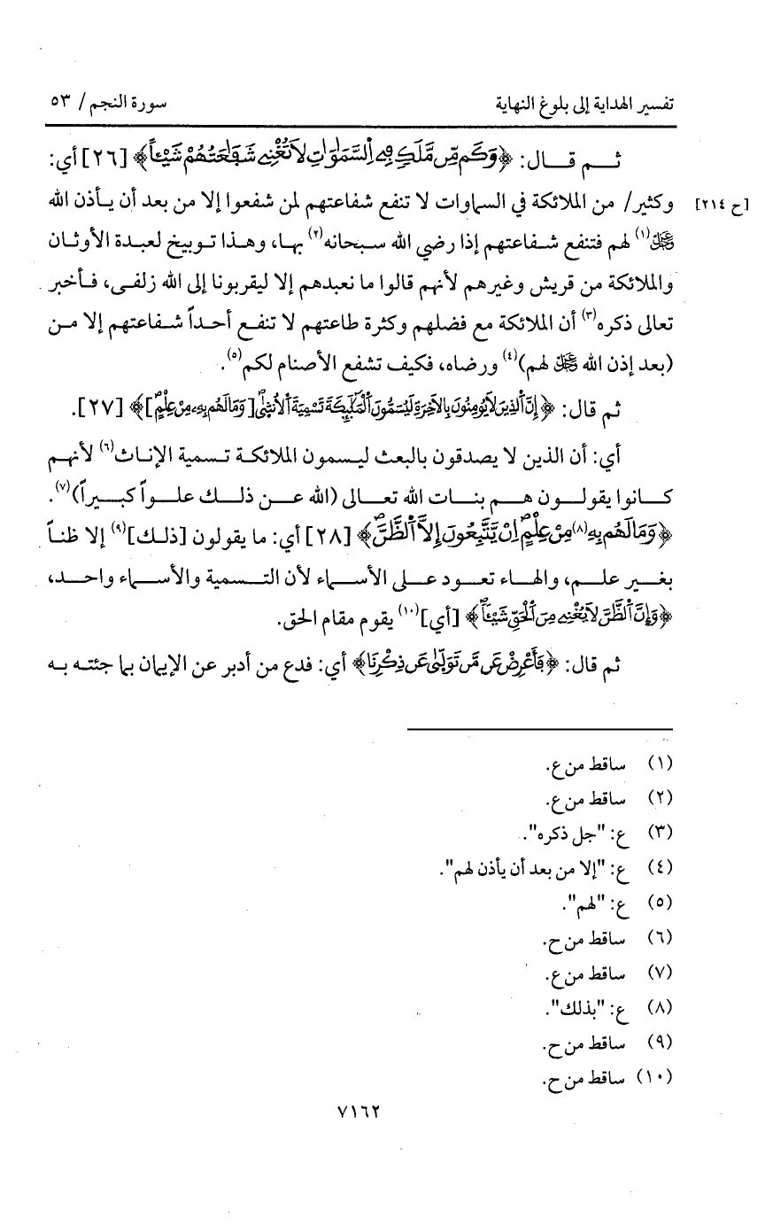 قال: {وَكَمْ مِّن مَّلَكٍ فِي السماوات لاَ تُغْنِي شَفَاعَتُهُمْ شَيْئاً} أي: وكثير / من الملائكة في السماوات لا تنفع شفاعتهم لمن شفعوا لمن شفعوا إلا من بعد أن يأذن الله D لهم فتنفع شفاعتهم إذا رضي الله سبحانه بها، وهذا توبيخ لعبدة الأوثان والملائكة من قريش وغيرهم لأنهم قالوا ما نعبدهم إلا ليقربونا إلى الله زلفى، فأخبر تعالى ذكره أن الملائكة مع فضلهم وكثرة طاعتهم لا تنفع أحداً شفاعتهم إلا من (بعد إذن الله D لهم) ورضاه، فكيف تشفع الأصنام لكم.