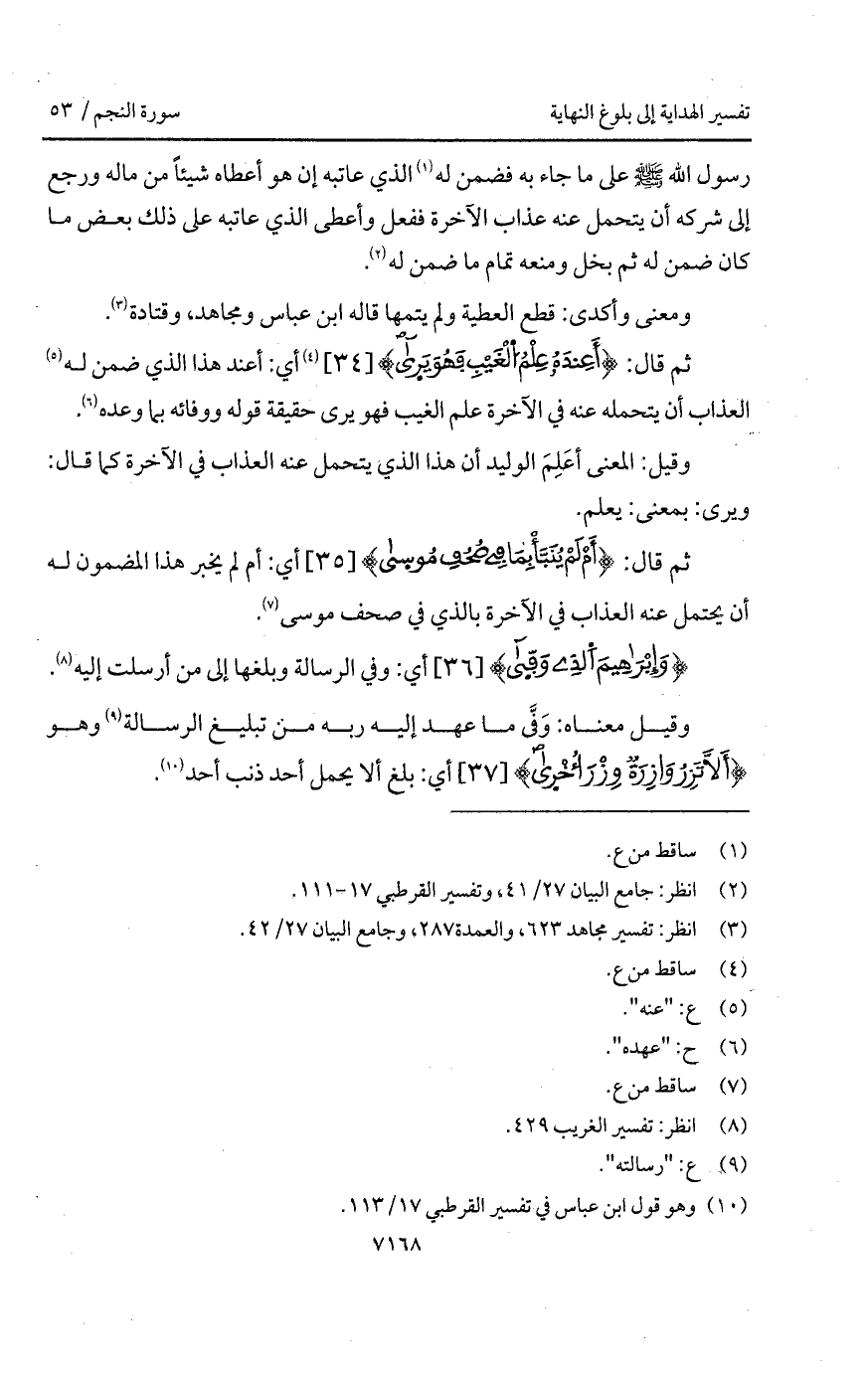 رسول الله A على ما جاء به فضمن له الذي عاتبه إن هو أعطاه شيئاً من ماله ورجع إلى شركه أن يتحمل عنه عذاب الآخرة ففعل وأعطى الذي عاتبه على ذلك بعض ما كان ضمن له ثم بخل ومنعه تمام ما ضمن له.