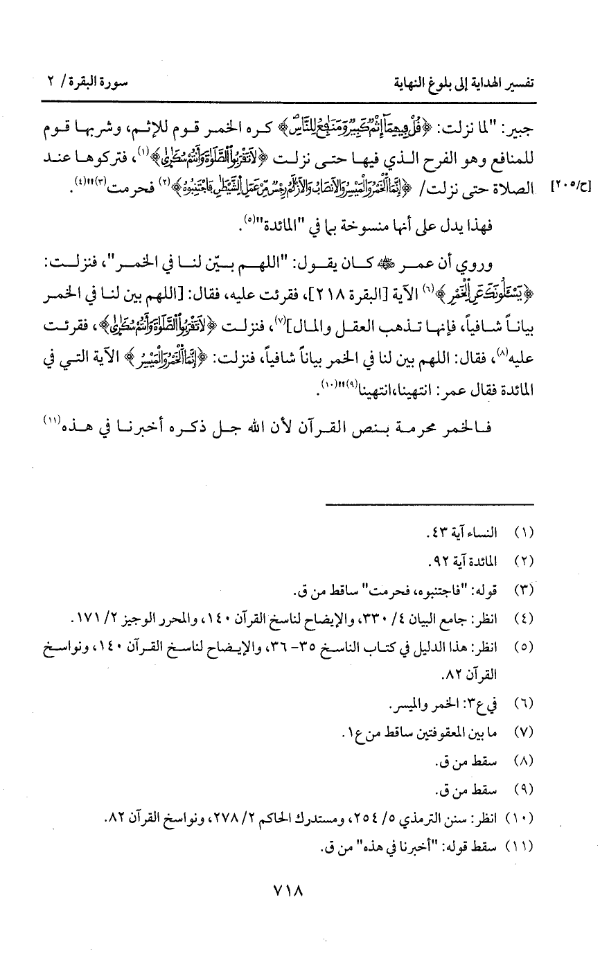 وروي أن عمر Bهـ كان يقول: " اللهم بيّن لنا في الخمر "، فنزلت: {يَسْأَلُونَكَ عَنِ الخمر} الآية، فقرئت ع ليه، فقال: [اللهم بين لنا في ال خمر بياناً شافياً، فإنها تذهب العقل والمال]، فنزلت {لاَ تَقْرَبُواْ الصلاة وَأَنْتُمْ سكارى}، فقرئت عليه، فقال: اللهم بين لنا في الخمر بياناً شافياً، فنزلت: {إِنَّمَا الخمر والميسر} الآية التي في المائدة فقال عمر: انتهينا، انتهينا ".