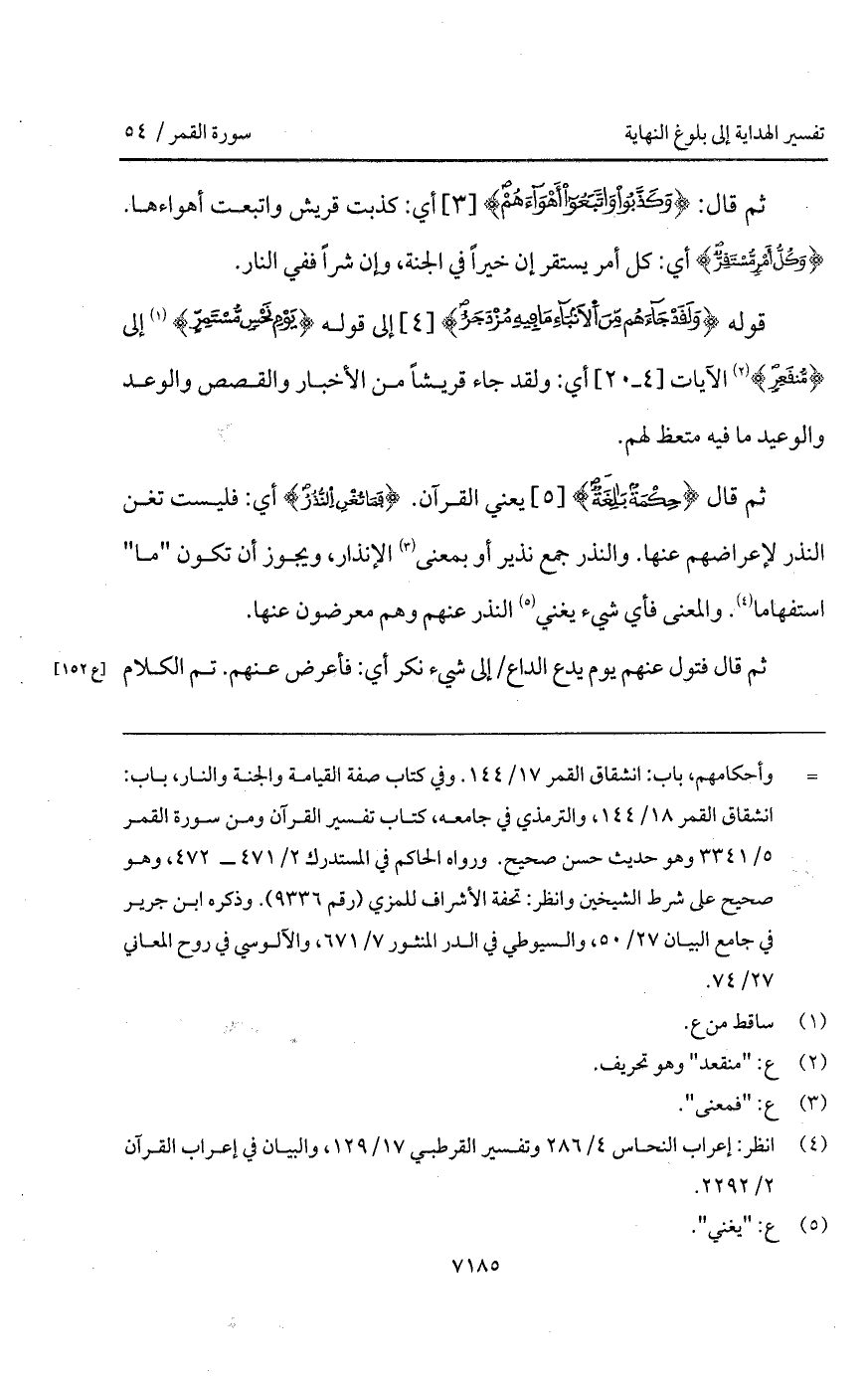 قال {حِكْمَةٌ بَالِغَةٌ} يعني القرآن. {فَمَا تُغْنِ النذر} أي: فليست تغن النذر لإعراضهم عنها. والنذر جمع نذير أو بمعنى الإنذار، ويجوز أن تكون " ما " استفهاماً. والمعنى فأي شيء يغني النذر عنهم وهم معرضون عنها.
