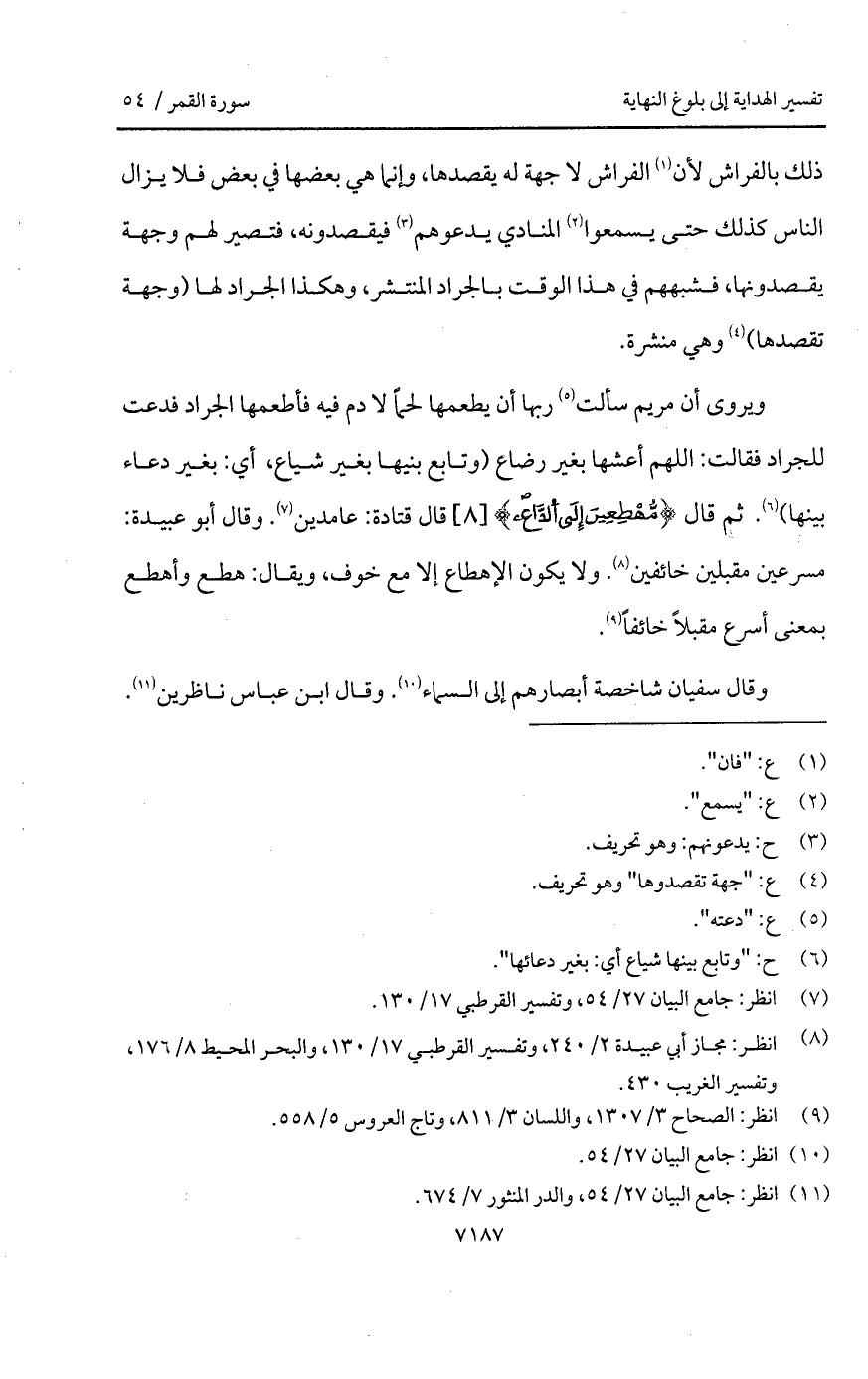 ويروى أن مريم سألت ربها أن يطعمها لحماً لا دم فيه فأطعمها الجراد فدعت للجراد فقالت: اللهم أعشها بغير رضاع (وتابع بنيها بغير شياع، أي: بغير دعاء بينها). ثم قال {مُّهْطِعِينَ إِلَى الداع} قال قتادة: عامدين. وقال أبو عبيدة: مسرعين مقبلين خائفين. ولا يكون الإهطاع إلا مع خوف، ويقال: هطع وأهطع بمعنى أسرع مقبلاً خائفاً.