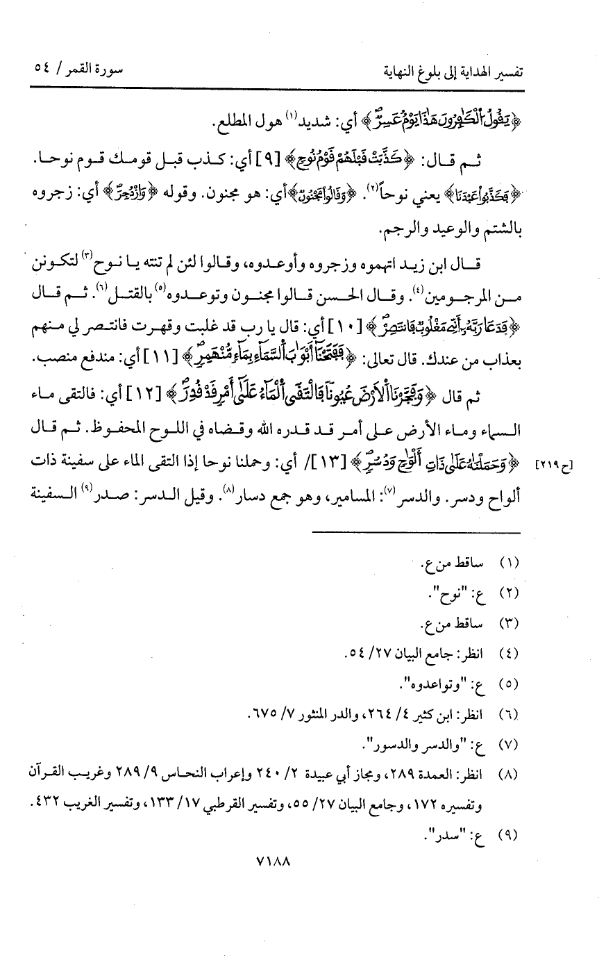 قال {وَفَجَّرْنَا الأرض عُيُوناً فَالْتَقَى المآء على أَمْرٍ قَدْ قُدِرَ} أي: فالتقى ماء السماء وماء الأرض على أمر قد قدره الله وقضاه في اللوح المحفوظ. ثم قال {وَحَمَلْنَاهُ على ذَاتِ أَلْوَاحٍ وَدُسُرٍ} / أي: وحملنا نوحا إذا التقى الماء على سفينة ذات ألواح ودسر. والدسر: المسامير، وهو جمع دسار. وقيل الدسر: صدر السفينة
