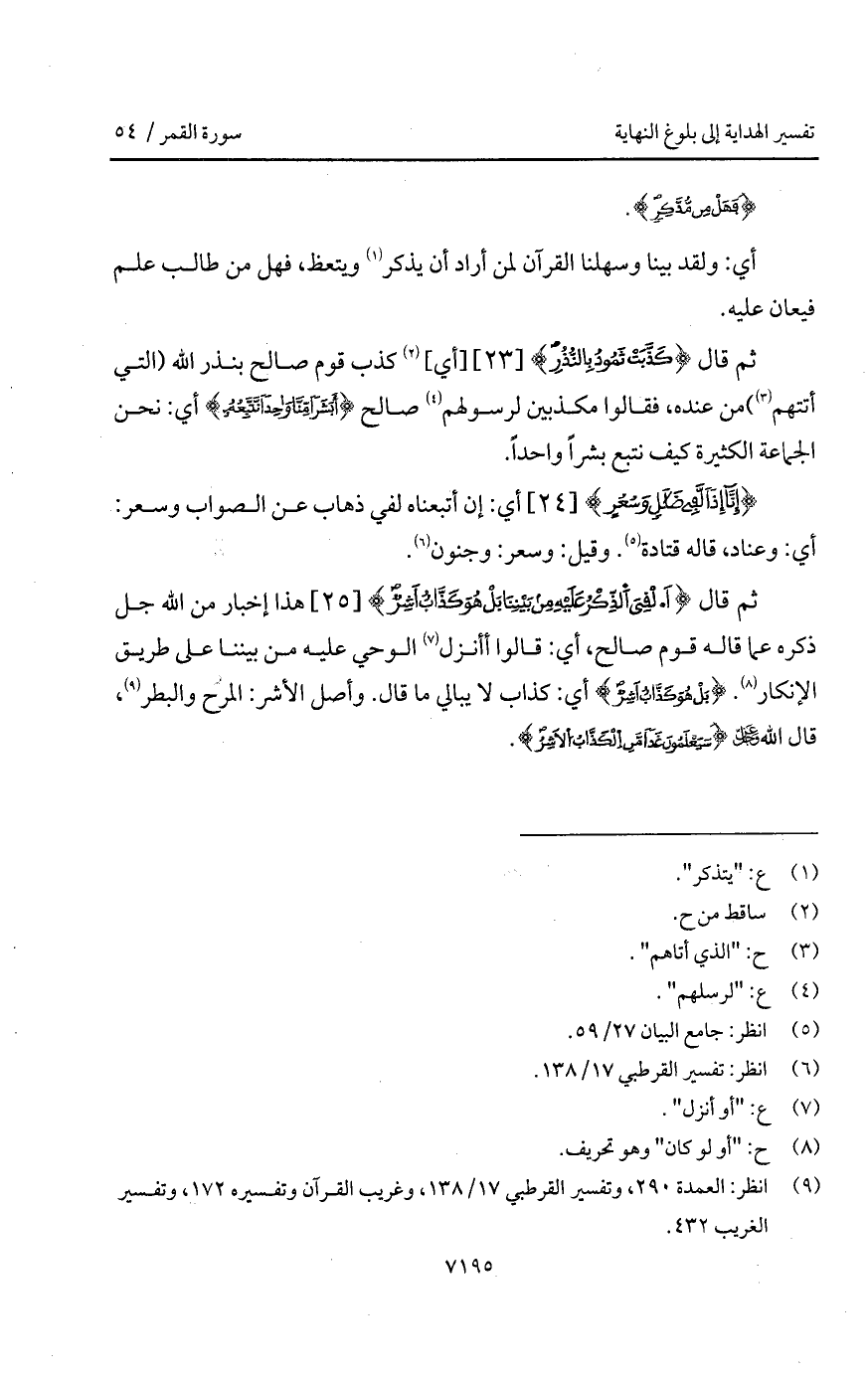 قال {كَذَّبَتْ ثَمُودُ بالنذر} [أي] كذب قوم صالح بنذر الله (التي أتتهم) من عنده، فقالوا مكذبين لرسولهم صالح {أَبَشَراً مِّنَّا وَاحِداً نَّتَّبِعُهُ} أي: نحن الجماعة الكثيرة كيف نتبع بشراً واحداً.
