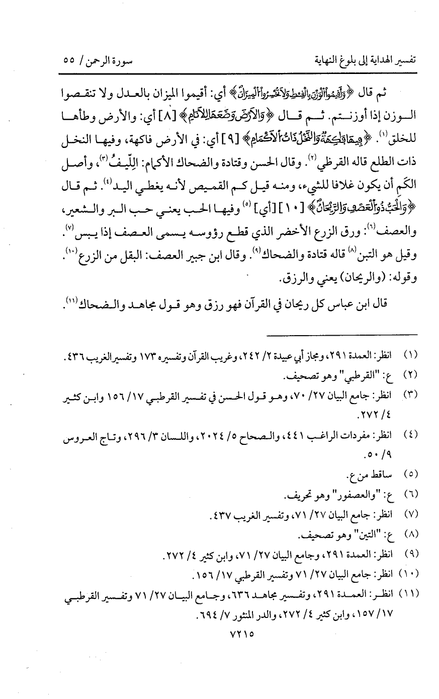 ثم قال {وَأَقِيمُواْ الوزن بالقسط وَلاَ تُخْسِرُواْ الميزان} أي: أقيموا الميزان بالعدل ولا تنقصوا الوزن إذا أوزنتم. ثم قال {والأرض وَضَعَهَا لِلأَنَامِ} أي: والأرض وطأها للخلق. {فِيهَا فَاكِهَةٌ والنخل ذَاتُ الأكمام} أي: في الأرض فاكهة، وفيها النخل ذات الطلع قاله القرظي. وقال الحسن وقتادة والضحاك الأكمام: الِلّيفُ، وأصل الكَمِ أن يكون غلافا للشيء، ومنه قيل كم القميص لأنه يغطي اليد. ثم قال {والحب ذُو العصف والريحان} [أي] وفيها الحب يعني حب البر والشعير، والعصف. ورق الزرع الأخضر الذي قطع رؤوسه يسمى العصف إذا يبس. وقيل هو التبن قاله قتادة والضحاك. وقال ابن جبير العصف: البقل من الزرع. وقوله: (والريحان) يعني والرزق.