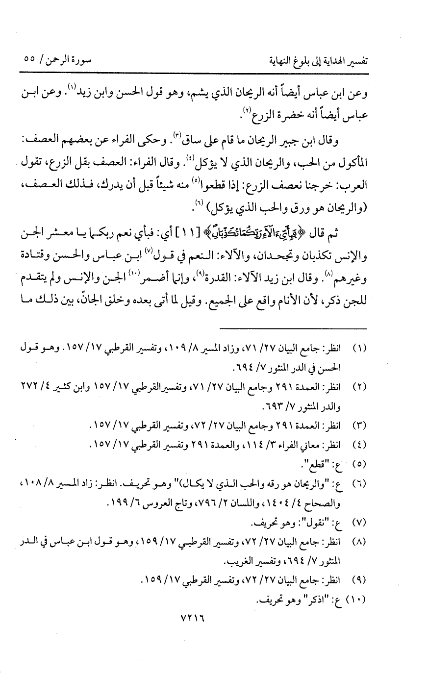 وقال ابن جبير الريحان ما قام على ساق. وحكى الفراء عن بعضهم العصف: المأكول من الحب، والريحان الذي لا يؤكل. وقال الفراء: العصف بقل الزرع، تقول العرب: خرجنا نعصف الزرع: إذا قطعوا منه شيئاً قبل أن يدرك، فذلك العصف، (والريحان هو ورق والحب الذي يؤكل).