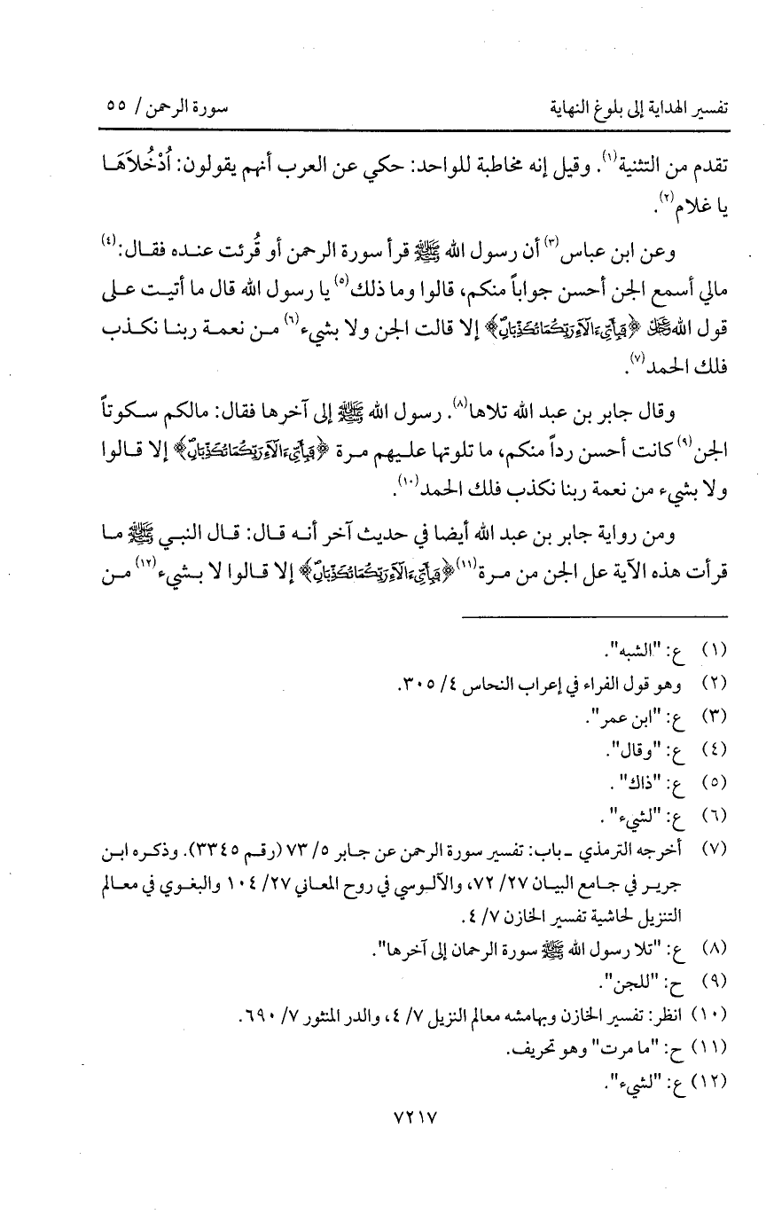 وقال جابر بن عبد الله تلاها. رسول الله A إلى آخرها فقال: " مالكم سكوتاً الجن كانت أحسن رداً منكم، ما تلوتها عليهم مرة {فَبِأَيِّ آلاء رَبِّكُمَا تُكَذِّبَانِ} إلا قالوا ولا بشيء من نعمة ربنا نكذب فلك الحمد ".