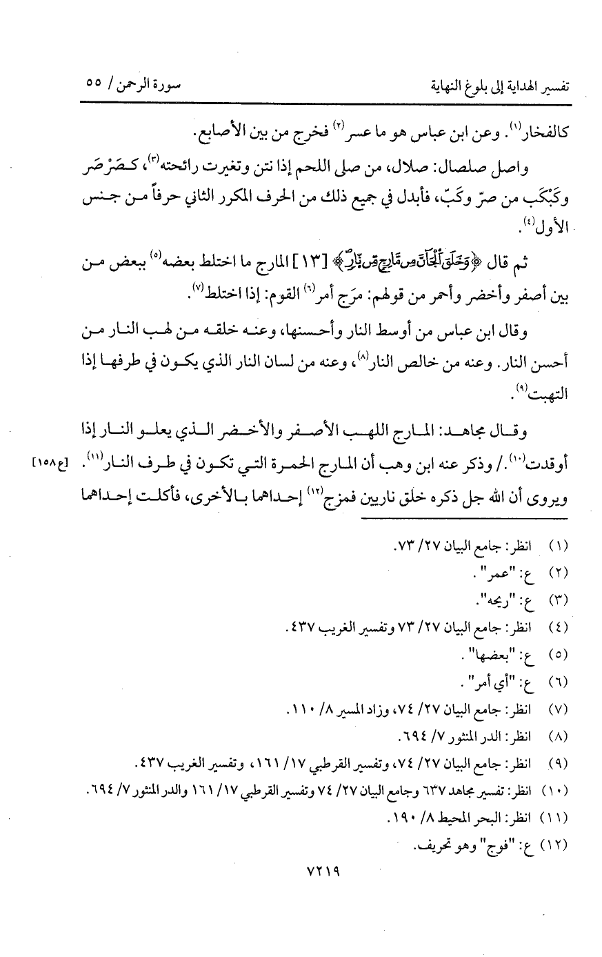 وقال مجاهد: المارج اللهب الأصفر والأخضر الذي يعلو النار إذا أوقدت. / وذكر عنه ابن وهب أن المارج الحمرة التي تكون في طرف النار. ويروى أن الله جل ذكره خلق نارين فمزج إحداهما بالأخرى، فأكلت إحداهما