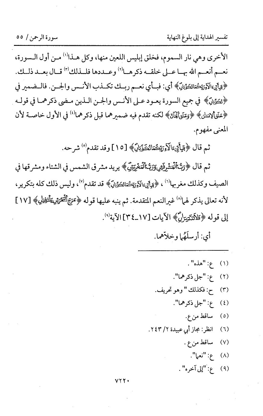 الأخرى وهي نار السموم، فخلق إبليس اللعين منها، وكل هذا من أول السورة، نعم أنعم الله بها على خلقه ذكرها وعددها فلذلك قال بعد ذلك. {فَبِأَيِّ آلاء رَبِّكُمَا تُكَذِّبَانِ} أي: فبأي نعم ربك تكذب الأنس والجن. فالضمير في {تُكَذِّبَانِ} في جميع السورة يعود على الأنس والجن الذين مضى ذكرهما في قوله {خَلَقَ الإنسان} {وَخَلَقَ الجآن} لكنه تقدم فيه ضميرهما قبل ذكرهما في الأول خاصة لأن المعنى مفهوم.