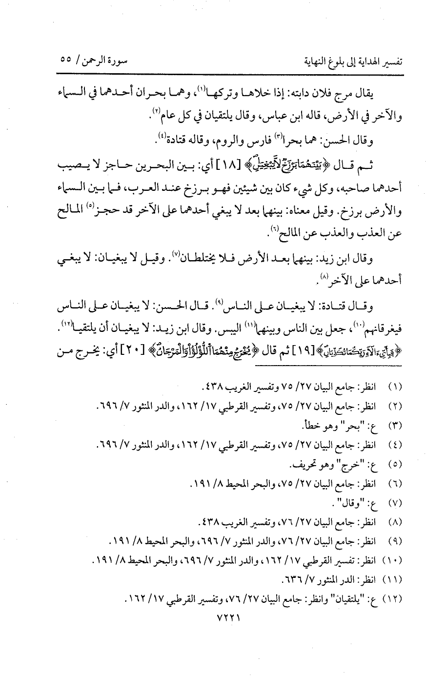 وقال قتادة: لا يبغيان على الناس. قال الحسن: لا يبغيان على الناس فيغرقانهم، جعل بين الناس وبينهما اليبس. وقال ابن زيد: لا يبغيان أن يلتقيا. {فَبِأَيِّ آلاء رَبِّكُمَا تُكَذِّبَانِ} ثم قال {يَخْرُجُ مِنْهُمَا الُّلؤْلُؤُ وَالمَرْجَانُ} أي: يخرج من