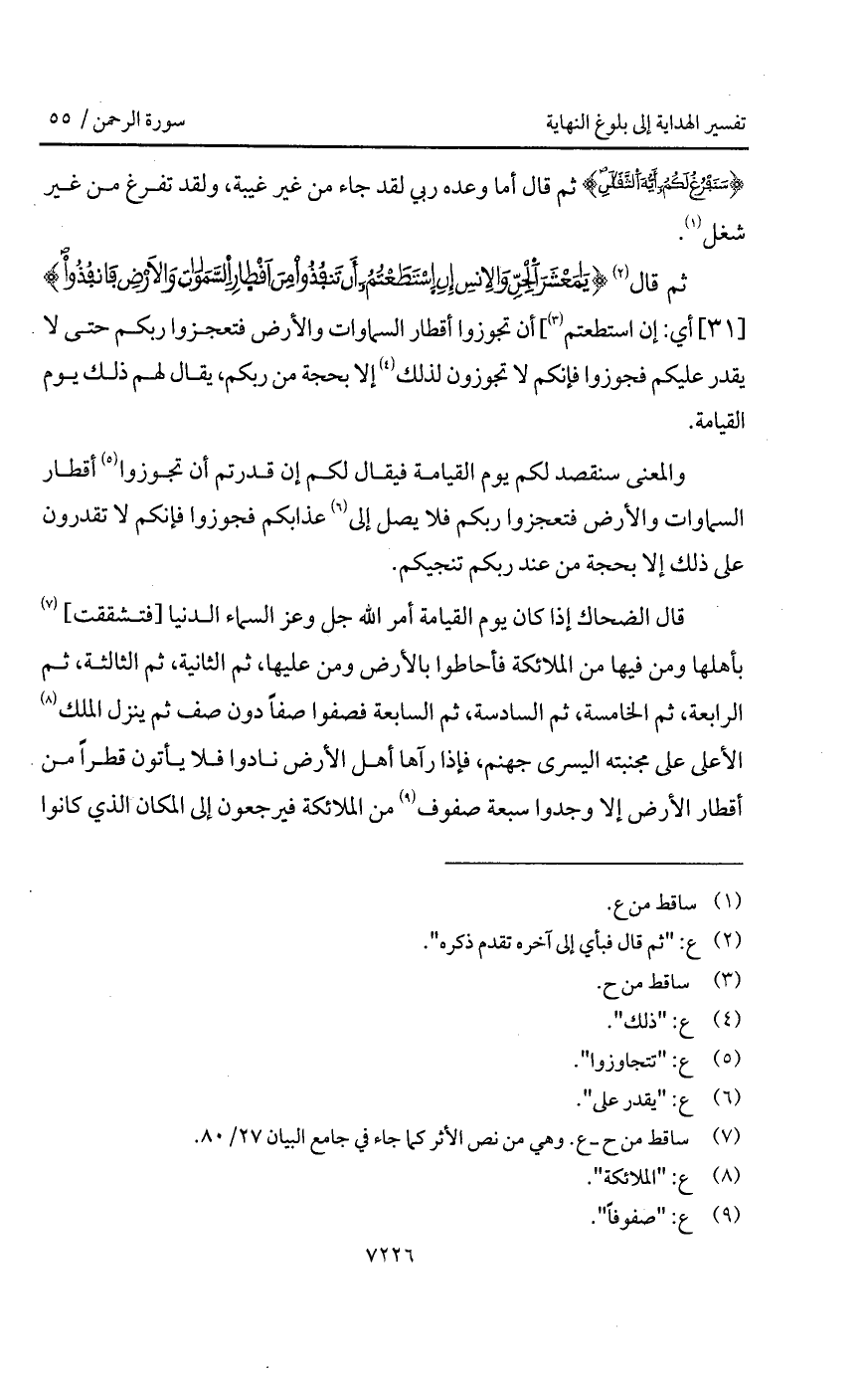 قال {يامعشر الجن والإنس إِنِ استطعتم أَن تَنفُذُواْ مِنْ أَقْطَارِ السماوات والأرض فانفذوا} أي: إن استطعتم] أن تجوزوا أقطار السماوات والرض فتعجزوا ربكم حتى لا يقدر عليكم فجوزوا فإنكم لا تجوزون لذلك إلا بحجة من ربكم، يقال لهم ذلك يوم القيامة.
