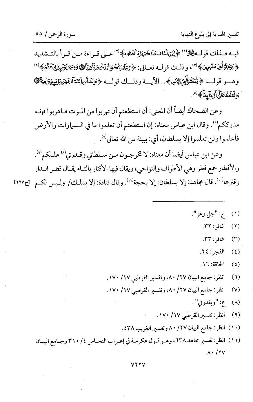 وعن ابن عباس أيضا أن معناه: لا تخرجون من سلطاني وقدرتي عليكم. والأقطار جمع قطر وهي الأطراف والنواحي، ويقال فيها الأقتار بالتاء يقال قطر الدار وقترها. قال مجاهد: إلا بسلطان: إلا بحجة. وقال قتادة: إلا بملك / وليس لكم