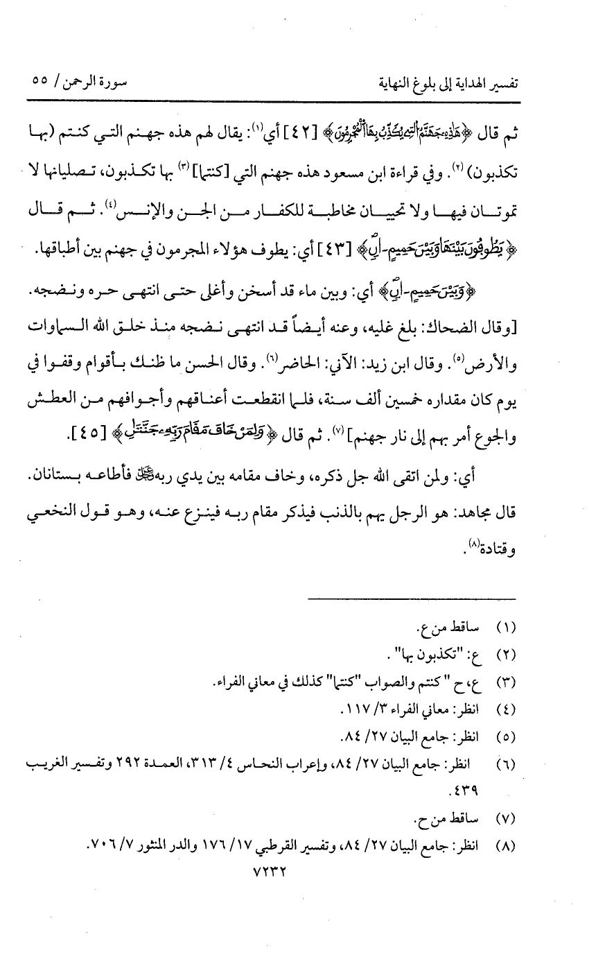 قال {هذه جَهَنَّمُ التي يُكَذِّبُ بِهَا المجرمون} أي: يقال لهم هذه جهنم التي كنتم (بها تكذبون). وفي قراءة ابن مسعود هذه جهنم التي [كنتما] بها تكذبون، تصليانها لا تموتان فيها ولا تحييان مخاطبة للكفار من الجن والإنس. ثم قال {يَطُوفُونَ بَيْنَهَا وَبَيْنَ حَمِيمٍ آنٍ} أي: يطوف هؤلاء المجرمون في جهنم بين أطباقها.