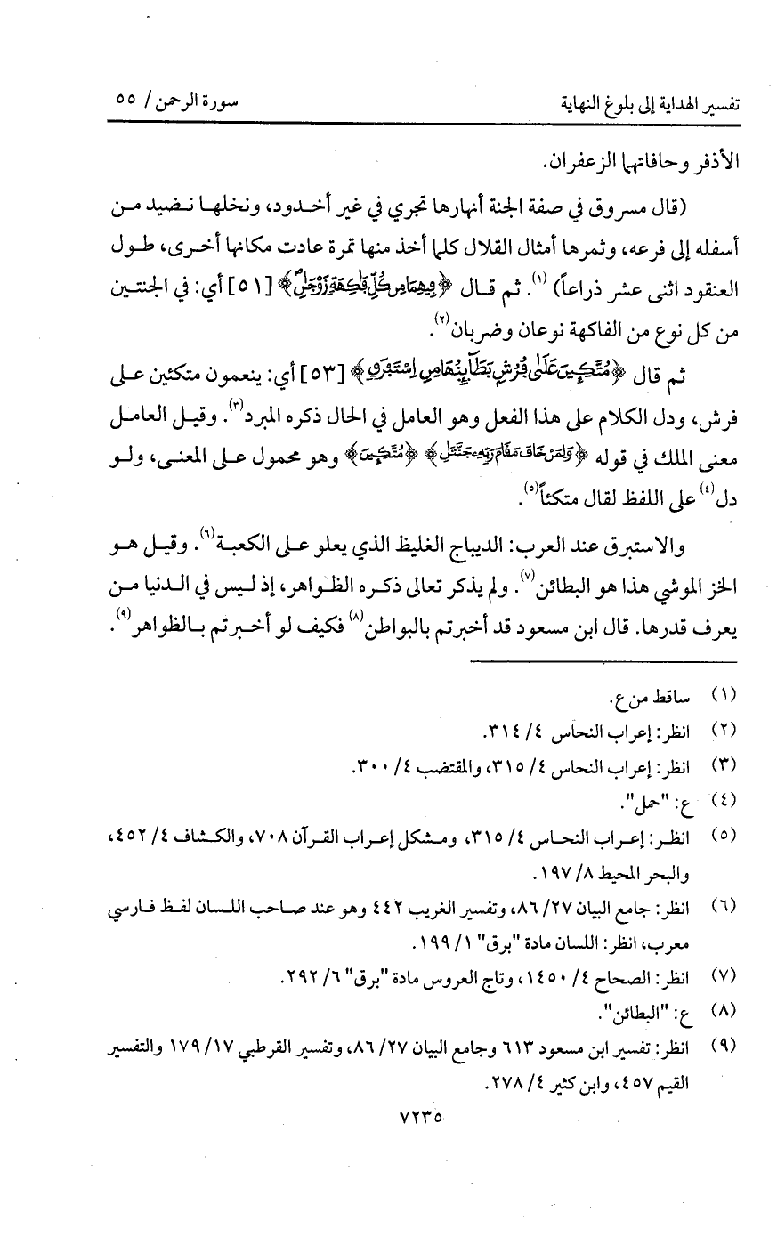 قال {مُتَّكِئِينَ عَلَى فُرُشٍ بَطَآئِنُهَا مِنْ إِسْتَبْرَقٍ} أي: ينعمون متكئين على فرش، ودل الكلام على هذا الفعل وهو العامل في الحال ذكره المبرد. وقيل العامل معنى الملك في قوله {وَلِمَنْ خَافَ مَقَامَ رَبِّهِ جَنَّتَانِ} {مُتَّكِئِينَ} وهو محمول على المعنى، ولو دل على اللفظ لقال متكئاً.
