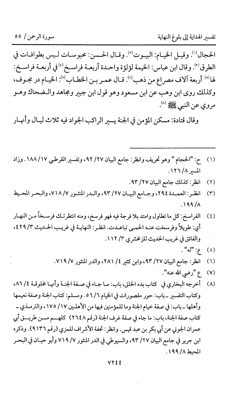 الحجال. وقيل الخيام: البيوت. وقال الحسن: محبوسات ليس بطوافات في الطرق. وقال ابن عباس: الخيمة لؤلؤة واحدة أربعة فراسخ في أربعة فراسخ: لها أربعة آلاف مصراع من ذهب. قال عمر بن الخطاب: الخيام در مجوف، وكذلك روى ابن وهب عن ابن مسعود وهو قول ابن جبير ومجاهد والضحاك وهو مروي عن النبي A.