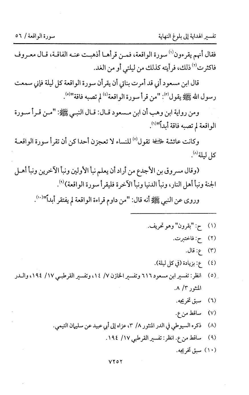 قال ابن مسعود أني قد أمرت بناتي أن يقرأن سورة الواقعة كل ليلة فإني سمعت رسول الله - صلى الله عليه وسلم - يقول: "من قرأ سورة الواقعة لم تصبه فاقة".