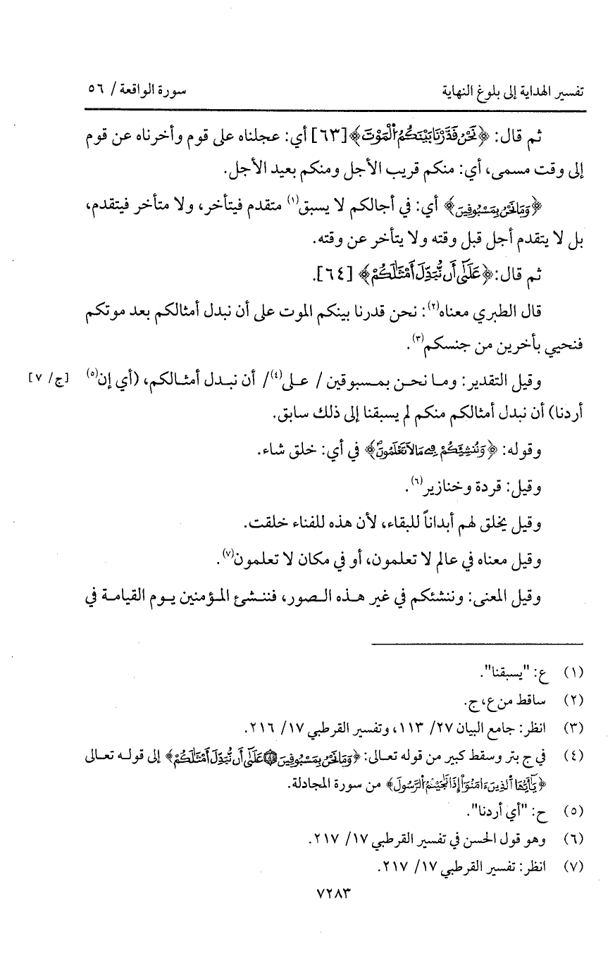 قال الطبري معناه: نحن قدرنا بينكم الموت على أن نبدل أمثالكم بعد موتكم فنحيي بأخرين من جنسكم.