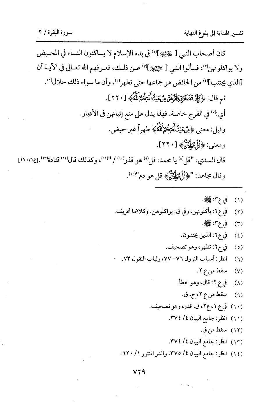 كان أصحاب النبي [عليه السلام] في بدء الإسلام لا يساكنون النساء في المحيض ولا يواكلونهن، فسألوا النبي [عليه السلام] عن ذلك، فعرفتهم الله تعالى في الآية أن [الذي يجتنب] من الحائض هو جماعها حتى تطهر، وأن ما سواء ذلك حلال.