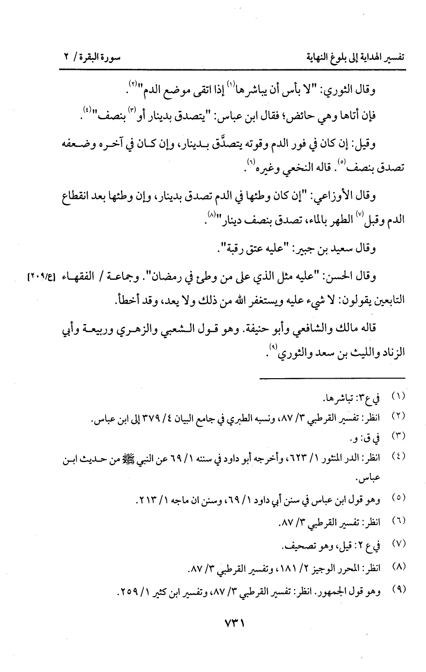 وقيل: إن كان في فور الدم وقوته يتصدَّق بدينار، وإن كان في آخره وضعفه تصدق بنصف. قاله النخعي وغيره.