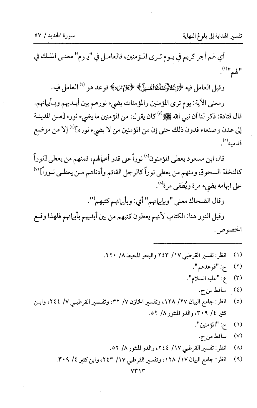 ومعنى الآية: يوم ترى المؤمنين والمؤمنات يضيء نورهم بين أيديهم وبأيمانهم. قال قتادة: ذكر لنا أن نبي الله A كان يقول: " من المؤمنين ما يضيء نوره [من المدينة إلى عدن وصنعاء فدون ذلك حتى إن من المؤمنين من لا يضيء نوره] إلا من موضع قدميه ".