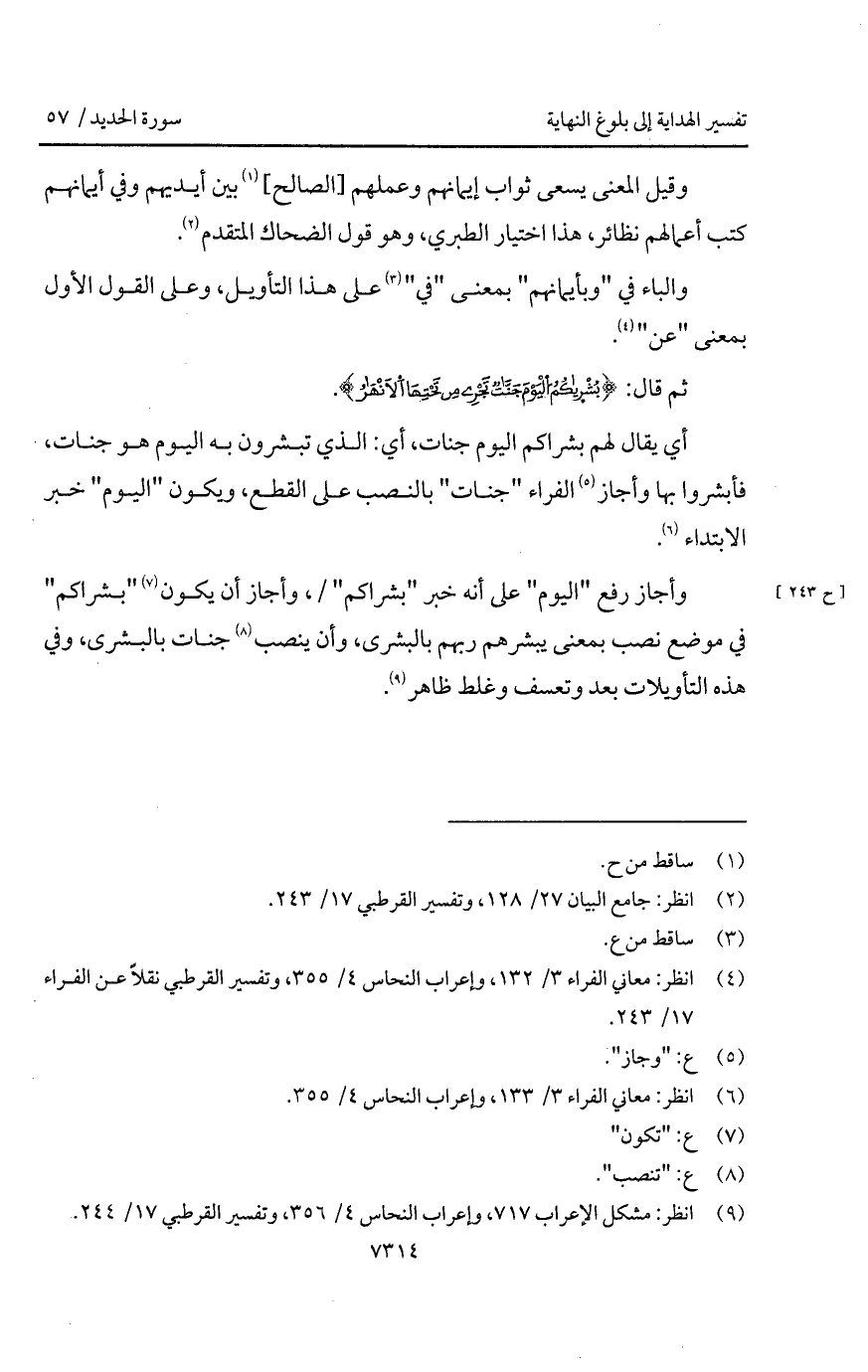 وأجاز رفع " اليوم " على أنه خبر " بشراكم " /، وأجاز أن يكون " بشراكم " في موضع نصب بمعنى يبشرهم ربهم بالبشرى، وأن ينصب جنات بالبشرى، وفي هذه التأويلات بعد وتعسف وغلط ظاهر.