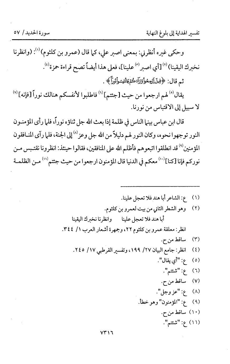 قال ابن عباس بينما الناس في ظلمة إذا بعث الله جل ثناؤه نوراً، فلما رأى المؤمنون النور توجهوا نحوه، وكان النور لهم دليلاً من الله جل وعز إلى الجنة، فلما رآى المنافقون المؤمنين قد انطلقوا اتبعوهم فأظلم الله على المنافقين، فقالوا حينئذ: انظرونا نقتبس من نوركم فإنا [كنا] معكم في الدنيا قال المؤمنون ارجعوا من حيث جئتم من الظلمة
