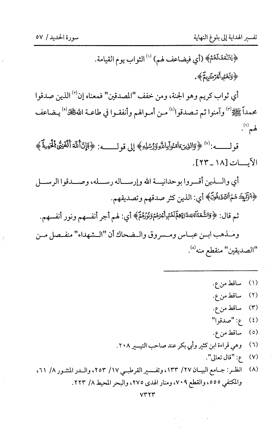 ثم قال: {والشهدآء عِندَ رَبِّهِمْ لَهُمْ أَجْرُهُمْ وَنُورُهُمْ} أي: لهم أجر أنفسهم ونور أنفسهم.