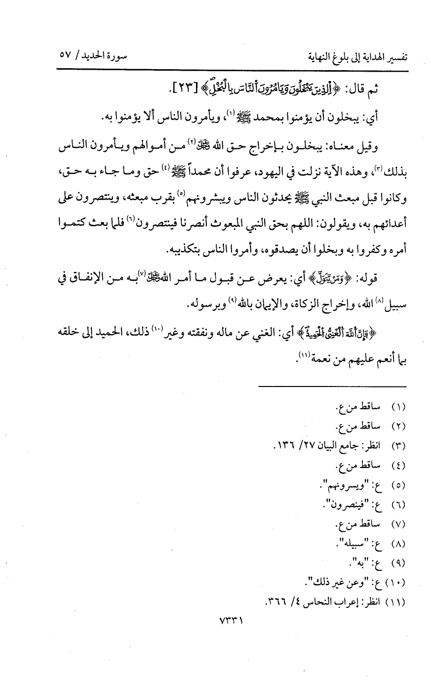 وقيل معناه: يبخلون بإخراج حق الله D من أموالهم ويأمرون الناس بذلك، وهذه الآية نزلت في اليهود، عرفوا أن محمداً A حق وما جاء به حق، وكانوا قبل مبعث النبي A يحدثون الناس ويبشرونهم بقرب مبعثه، وينتصرون على أعدائهم به، ويقولون: اللهم بحق النبي المبعوث أنصرنا فينتصرون فلما بعث كتموا أمره وكفروا به وبخلوا أن يصدقوه، وأمروا الناس بتكذيبه.