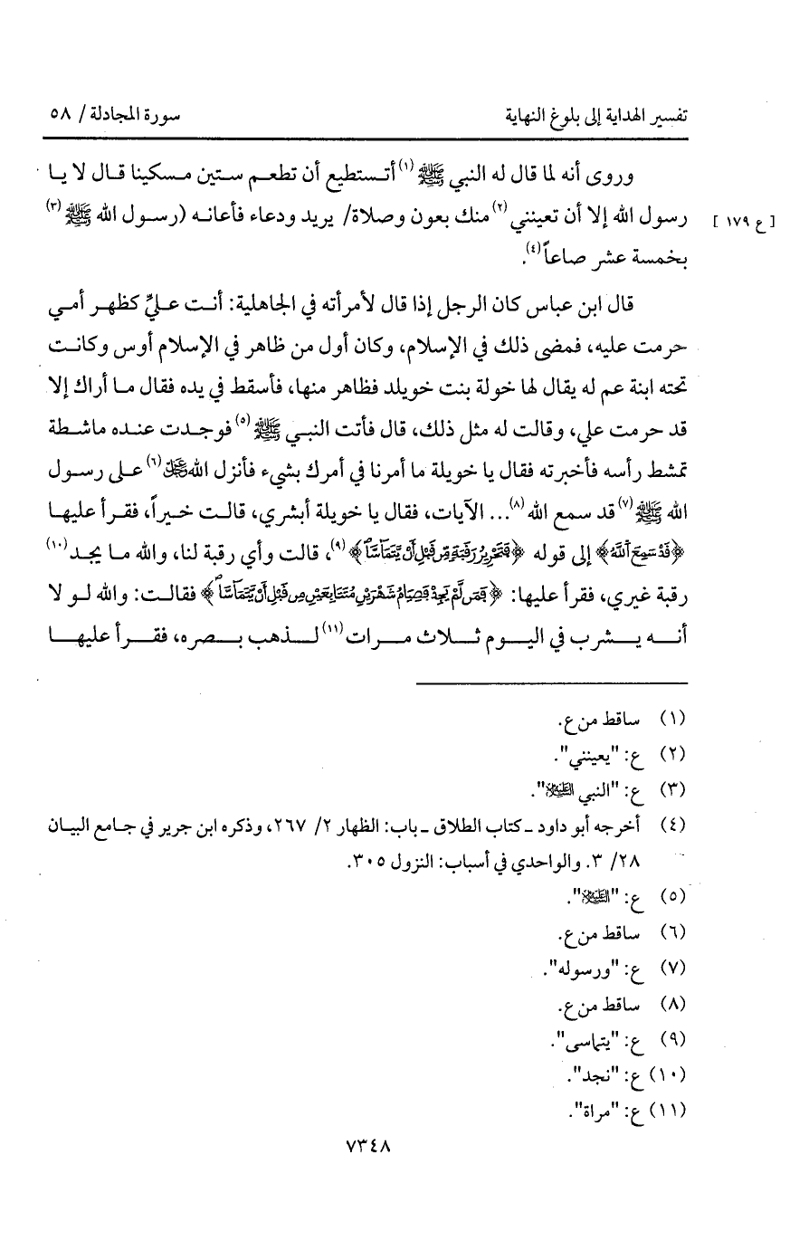 قال ابن عباس كان الرجل إذا قال لأمراته في الجاهلية: أنت عليِّ كظهر أمي حرمت عليه، فمضى ذلك في الإسلام، وكان أول من ظاهر في الإسلام أوس وكانت تحته ابنة عم له يقال لها خولة بنت خويلد فظاهر منها، فأسقط في يده فقال ما أراك إلا قد حرمت علي، وقالت له مثل ذلك، قال فأتت النبي A فوجدت عنده ماشطة تمشط رأسه فأخبرته فقال يا خويلة ما أمرنا في أمرك بشيء فأنزل الله D على رسول الله A قد سمع الله. . . الآيات، فقال يا خويلة أبشري، قالت خيراً، فقرأ عليها {قَدْ سَمِعَ الله} إلى قوله {فَتَحْرِيرُ رَقَبَةٍ مِّن قَبْلِ أَن يَتَمَآسَّا}، قالت وأي رقبة لنا، والله ما يجد رقبة غيري، فقرأ عليها: {فَمَن لَّمْ يَجِدْ فَصِيَامُ شَهْرَيْنِ مُتَتَابِعَيْنِ مِن قَبْلِ أَن يَتَمَآسَّا} فقالت: والله لولا أنه يشرب في اليوم ثلاث مرات لذهب بصره، فقرأ عليها
