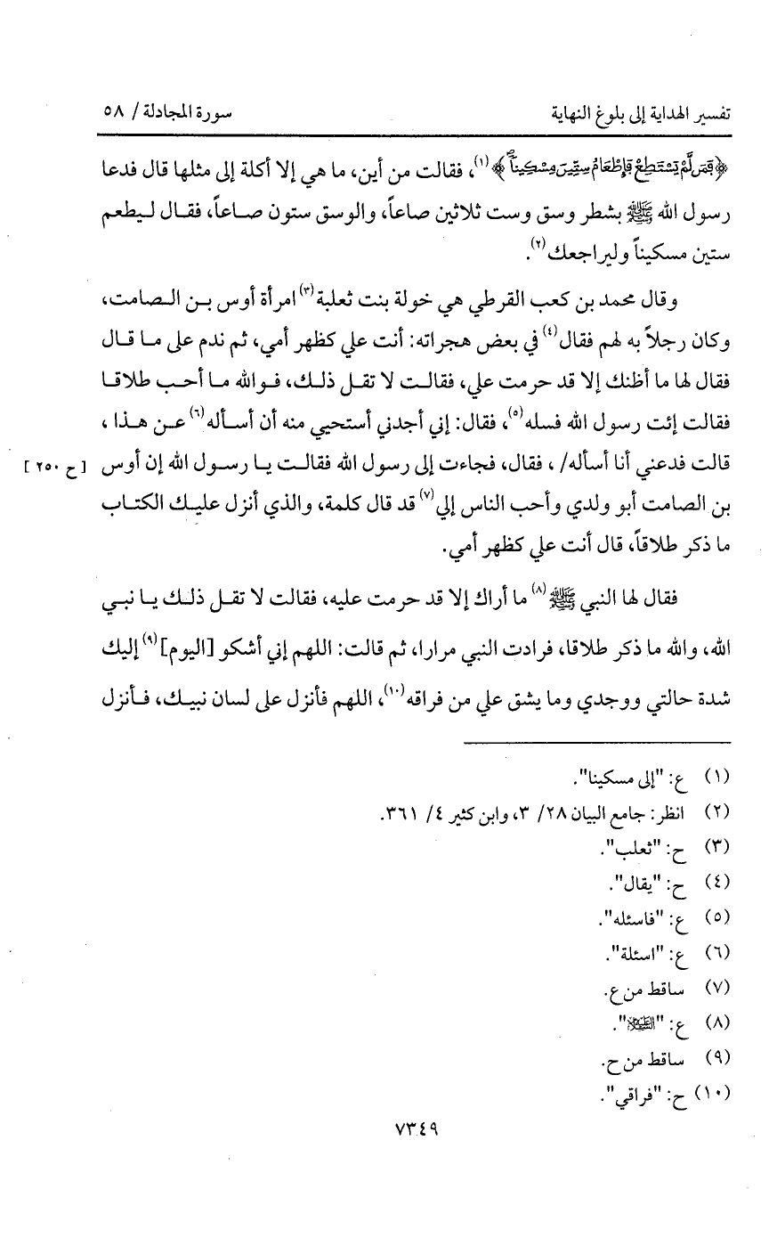 وقال محمد بن كعب القرطي هي خولة بنت ثعلبة امرأة أوس بن الصامت، وكان رجلاً به لهم فقال في بعض هجراته: أنت علي كظهر أمي، ثم ندم على ما قال فقال لها ما أظنك إلا قد حرمت علي، فقالت لا تقبل ذلك، فوالله ما أحب طلاقا فقالت إئت رسول الله فسله، فقال: إنني أجدني أستحيي منه أن أسأله عن هذا، قالت إئت رسول الله فسله، فقال: إني أجدني أستحيي منه أن أسأله عن هذا، قالت فدعني أنا أسأله /، فقال، فجاءت إلى رسول الله فقالت يا رسول الله إن أوس بن الصامت أبو ولدي وأحب الناس إلي قد قال كلمة، والذي أنزل عليك الكتاب ما ذكر طلاقاً، قال أنت علي كظهر أمي.