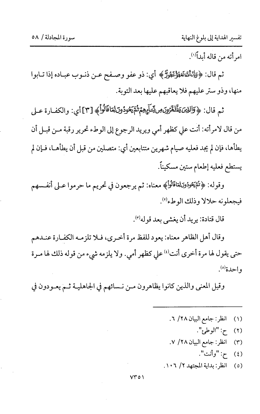 قال: {والذين يُظَاهِرُونَ مِن نِّسَآئِهِمْ ثُمَّ يَعُودُونَ لِمَا قَالُواْ} أي: والكفارة على من قال لامرأته: أنت علي كظهر أمي ويريد الرجوع إلى الوطء تحرير رقبة من قبل أن يطأها، فإن لم يجد فعليه صيام شهرين متتابعين أي: متصلين من قبل أن يطأها، فإن لم يستطع فعليه إطعام ستين مسكيناً.