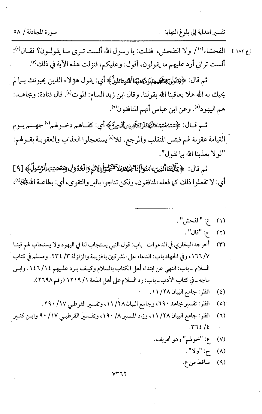 الفحشاء / ولا التفحش، فقلت: يا رسول الله ألست ترى ما يقولون؟ فقال: ألست تراني أرد عليهم ما يقولون، أقول: وعليكم، فنزلت هذه الآية في ذلك ".