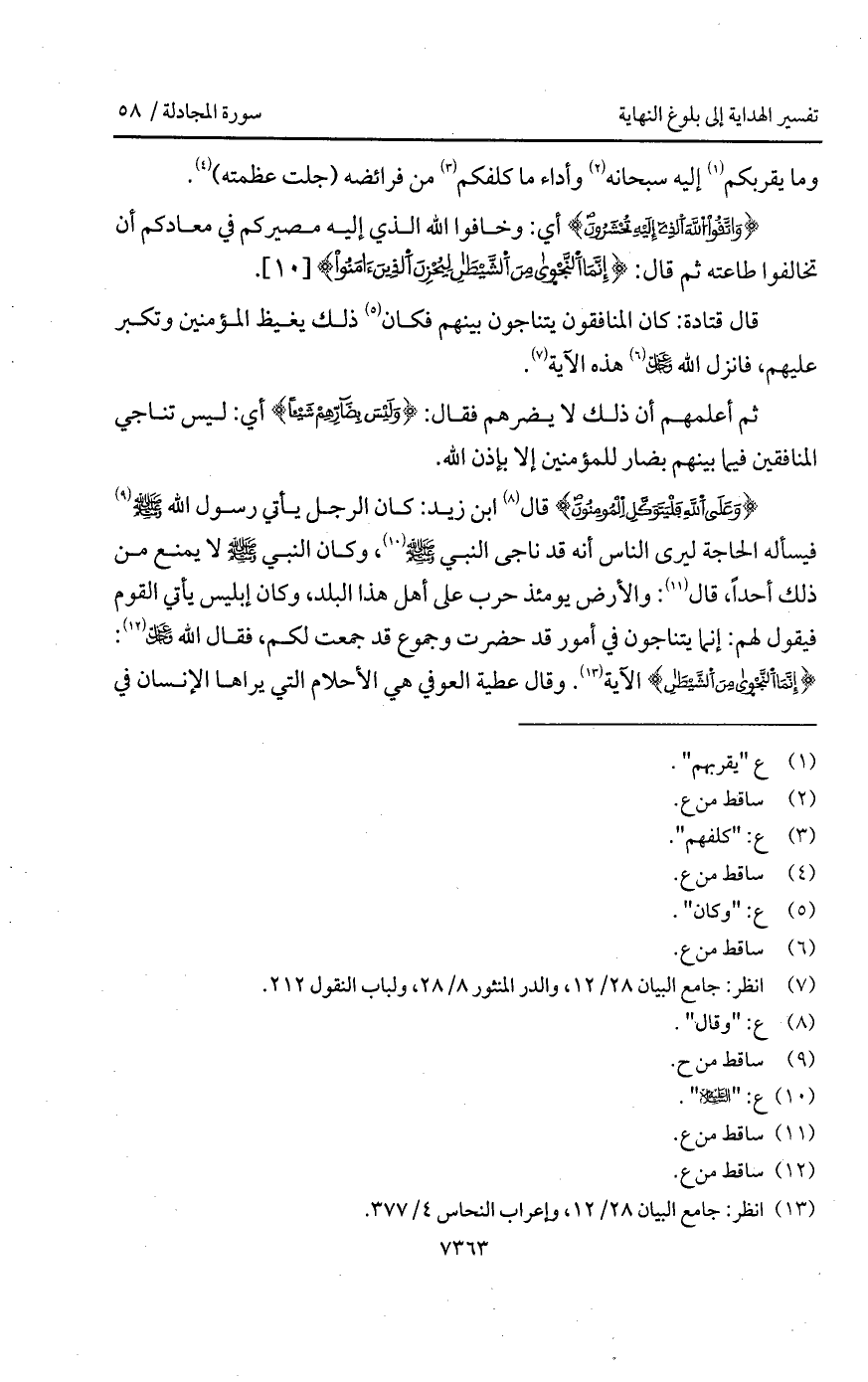{وَعَلَى الله فَلْيَتَوَكَّلِ المؤمنون} قال ابن زيد: كان الرجل يأتي رسول الله A فيسأله الحاجة ليرى الناس أنه قد ناجى النبي A، وكان النبي A لا يمنع من ذلك أحداً، قال: والأرض يومئذ حرب على أهل هذا البلد، وكان إبليس يأتي القوم فيقول لهم: إنما يتناجون في أمور قد حضرت وجموع قد جمعت لكم، فقال الله D: { إِنَّمَا النجوى مِنَ الشيطان} الآية. وقال عطية العوفي هي الأحلام التي يراها الإنسان في
