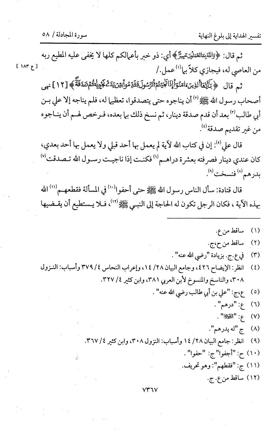 قال {يا أيها الذين آمَنُواْ إِذَا نَاجَيْتُمُ الرسول فَقَدِّمُواْ بَيْنَ يَدَيْ نَجْوَاكُمْ صَدَقَةً} نهى أصحاب رسول الله A أن يناجوه حتى يتصدقوا، تعظيما له، فلم يناجه إلا علي بن أبي طالب بعد أن قدم صدقة دينار، ثم نسخ ذلك بما بعده، فرخص لهم أن يناجوه من غير تقديم صدقة.
