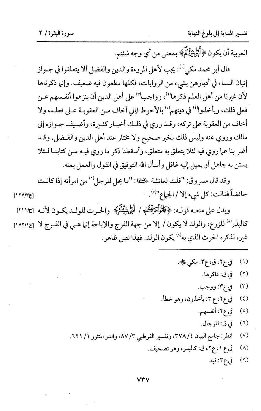قال أبو محمد مكي: يجب لأهل المروءة والدين والفضل ألا يتعلقوا في جواز إتيان النساء في أدبارهن بشيء من الروايات، فكلها مطعون فيه ضع يف. وإنما ذكرناها لأن غيرنا من أهل العلم ذكرها، وواجب على أهل الدين أن ينزهوا أنفسهم عن فعل ذلك، ويأخذوا في دينهم بالأحوط فإني أخاف من العقوبة على فعله، ولا أخاف من العقوبة على تركه، وقد روي في ذلك أخبلار كثيرة، وأضيف جوازه إلى مالك وروي عنه وليس ذلك بخبر صحيح ولا مختار عند أهل الدين والفضل. وقد أضر بنا عما روي فيه لئلا يتعلق به متعلق، وأسقطنا ذكر ما روي فيه من كتابنا لئلا يستن به جاهل أو يميل إليه غافل وأسأل الله التوفيق في القول والعمل بمنه.